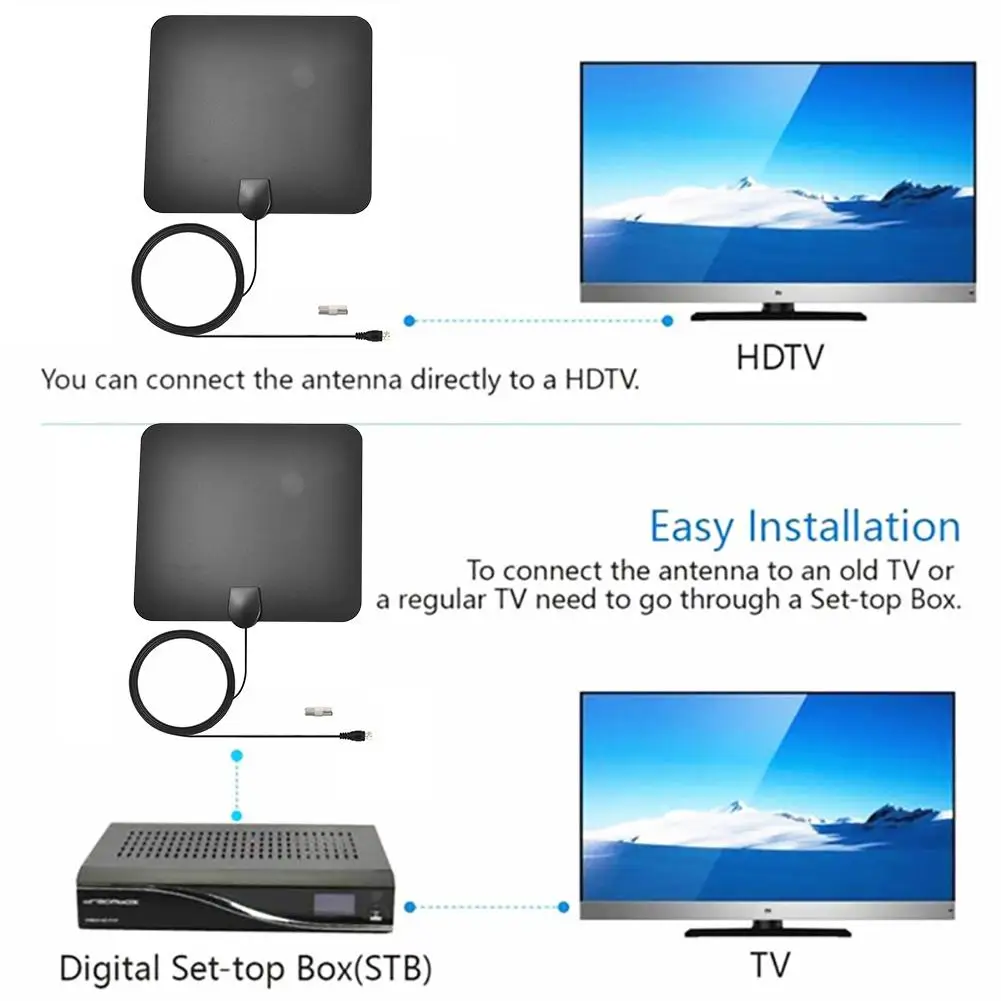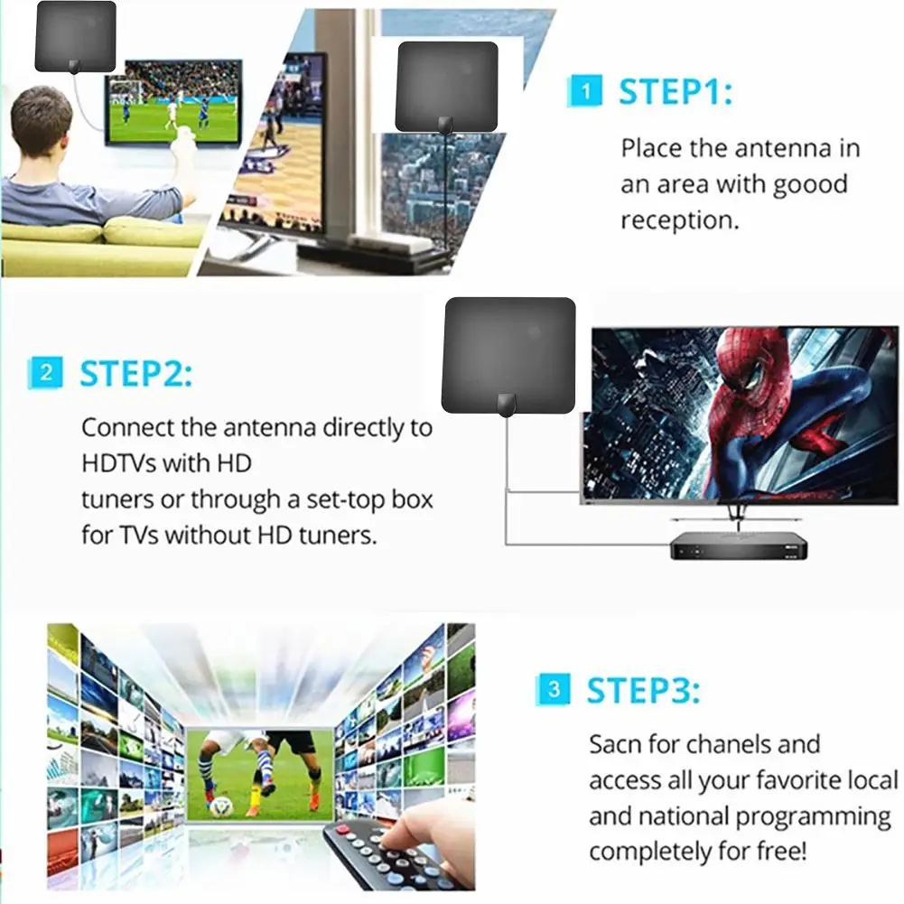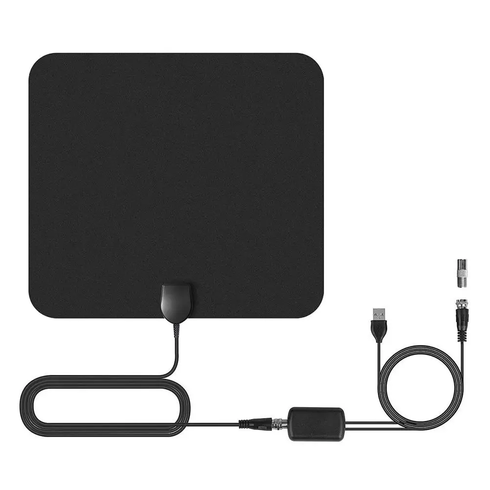 Description: Super thin indoor HDTV antenna: Our super thin antenna is specially designed for receiving digital over-the-air (OTA) TV broadcasts from all your local television stations. So never pay hugely expensive cable or satellite fees again and get all your local channels in crystal clear quality, absolutely free.Indoor HDTV antenna features: Excellent reception on all FM/VHF/UHF channels. Can be safely painted to match any home decoration without affecting reception or resulting in signal loss. The super soft, unobtrusively thin design and powerful reception capabilities make this antenna a top choice for any home. Indoor TV antenna specifications: frequency range: 47-230MHz, 470-862MHz receiving range: FM/VHF/UHFGain: 28dB output level: 100dBμVImpedance: 75ΩNoise figure: ≤3dB antenna cable length:3.3M Features: 1. Free Full HD Channels: High-quality new generation aerial can man get rid of the high fees for watching digital TV. This Aerial is compatible with TV converter boxes and hundreds of digital televisions/4K ultra high definition (4K UHD) TVs like ABC, CBS, NBC, PBC, Fox. including local news, kid and sport, weather forecast, cartoons and educational programs etc. Easy and free tool for life to receive the channel without monthly bill. 2. Easy To Use: TV antenna light as a feather, allows you to place it almost anywhere and no power required. With the unique plastic shell and silver slurry imported from the US, all the accessories are all pure copper to assure the contact loose. Digital HDTV antenna with 16.5ft coax cable. Amplifier Signal Booster, Spare 3M Sticker. Installation is a breeze with only 3 steps: unwrap, plug it and scan channels. You can place it high on window (strongly recommended) 3. Upgraded Amplifier and 960 MILES Long Range: The reception of this HDTV Aerial has optimized to the most resonable condition, included detachable amplifier to picks up signals within maxmal 960 miles range. which the gain of the amplifier is generally higher than that of the 2-4DB. The reception of this Aerial can be claimed to be the latest technology in 2018, which the reception upgrated 5-10% than the last version. 4. Full HD Crystal Clear TV: The new environmentally friendly flame retardant PC soft material and high-performance ultra-thin design bring moisture and lightning protection to our indoor HDTV Aerial. Our smart TV antenna adopt upgraded amplifier signal booster with built-in smart IC chip next generation and crystal clear filter technology to picks up signals within 960 miles range. The new technology filters out cellular and FM signals resulting in clearer picture, low noise Specification: Type: indoor digital TV antenna Size: about 250*220mm/9.84*8.66in Frequency range: VHF170-230/UHF470-862Mhz Gain: 25DB (with amplifier) Voltage standing wave ratio ≤ 2.0 Input impedance: 75Ω Working voltage: USB interface 5V/1A Interface form: F male + IEC adapter (can be customized) Operating temperature: -40 ° C ~ +85 ° C Working humidity: 20-80% Setup guide: Step 1: Connect the end of attached coaxial cable to the ANT/IN connector on the back of the TV or Digital Converter Box,Plug the USV plug into the USB port of the TV or Digital Converber Box. Step 2: Hand held the antenna, near the window, place it horizontally or vertically. Step 3: In the TV’s or STB ’s setup menu, set the tuner mode to “ Antenna ” or “ Air ”For more detailed instructions, please refer to your TV manual. Step 4: In the TV’ s or STB ’ s setup menu, set TV to “ scan ” for channels. This can sometimes be listed as auto-program,auto-scan,channel search or channel scan. Consult the TV manual or detailed instructions. Step 5: If reception is sporadic, try moving the antenna to another location and rescanning the TV until optimal postition is found. Step 6: Fix the antenna at the optimal position you found. Packing List: 1 x HDTV Antenna Notes: 1. HDTVs, please check the TV's manual to make sure the TV has a built-in tuner for receiving over-the-air broadcast, and make sure this tuner can receive HD signals or else it will not be able to receive and watch HD channels. 2. Retune your TV and/or digital box from time to time to ensure you are receiving all available services. Retuning takes only a few minutes using the remote control.3.Signal quality determines the picture quality and how many channels you can receive. Once you receive the antenna, hook it up to your TV, and try moving it around your home to find the placement with the best signal. You might be surprised how many HD channels you can receive! 3. This is an amplified antenna. If a signal cannot be received when using the external amplifier, remove the amplifier and try again. In some instances the amplifier may cause self-oscillation.