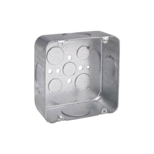 Electrical Square Outlet Box; Height 4-11/16 Inch; Width 4-11/16 Inch; Depth 2-1/8 Inch; Capacity 42 Cubic Inch; Number of Knockouts 9; Knockout Location (5) Bottom, (4) Side; Knockout Size (3) 1/2 Inch Conduit Bottom, (2) 3/4 Inch Conduit Bottom, (4) 1-1/4 Inch Conduit Side; Material Drawn Steel; Standard Package 25; Approval UL 514A/B/C; Used On Conduit; Application Non-Hazardous Location; Applicable Standard NEC/CEC