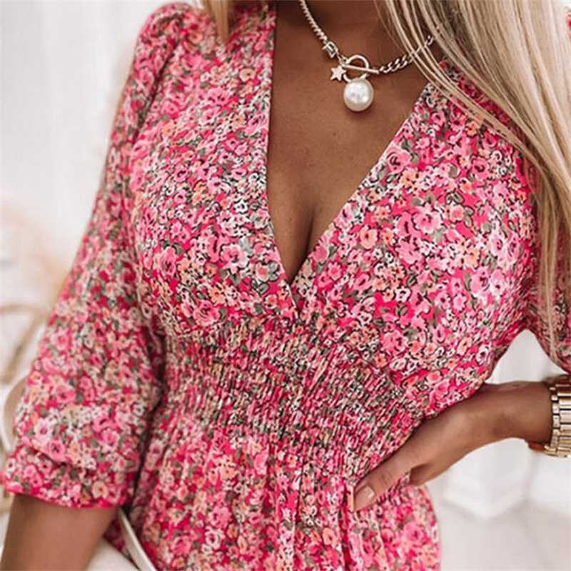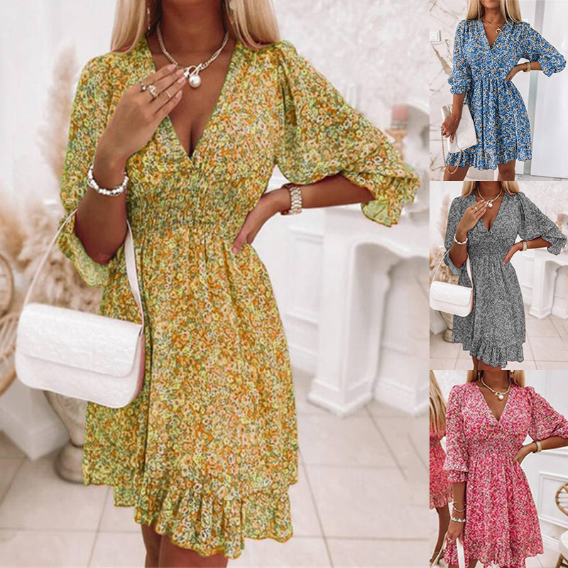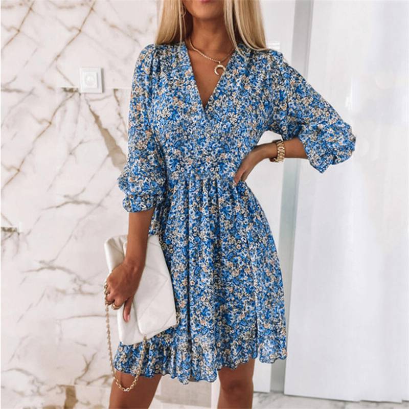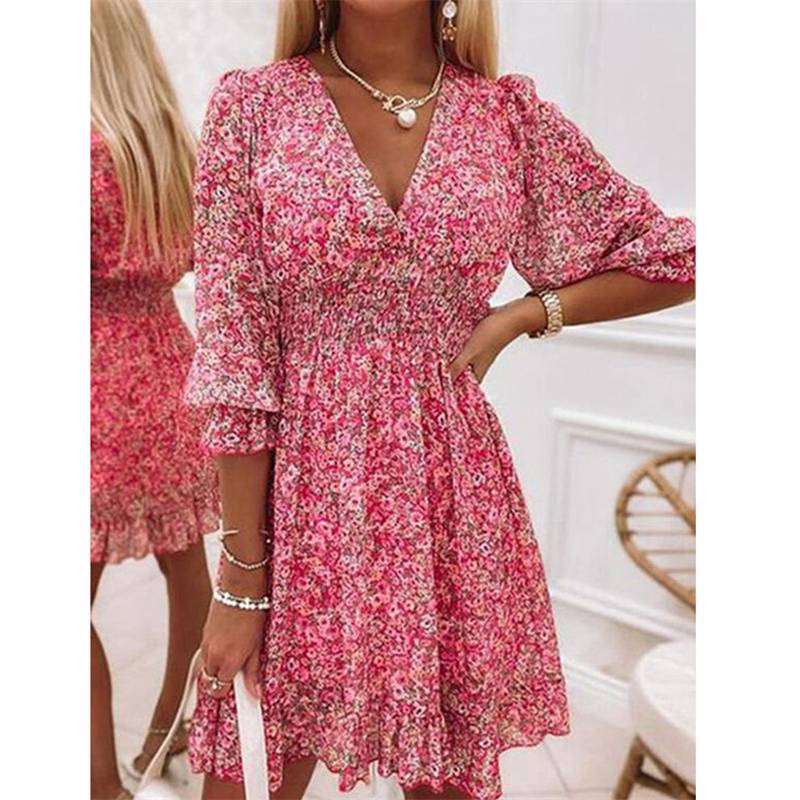 Ladies Tropical Tunic Sundress 3/4 Sleeve Womens Holiday Dress V neck Swing
