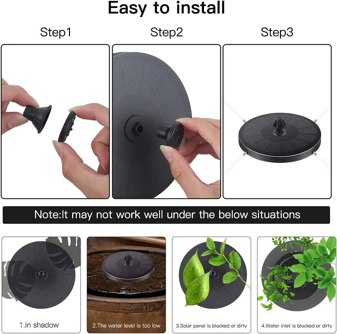 Just place the solar water pump in the water, it will start to work automatically within 3 seconds. Make sure you have put enough water in the fountain so that the pump can stay entirely under the water.