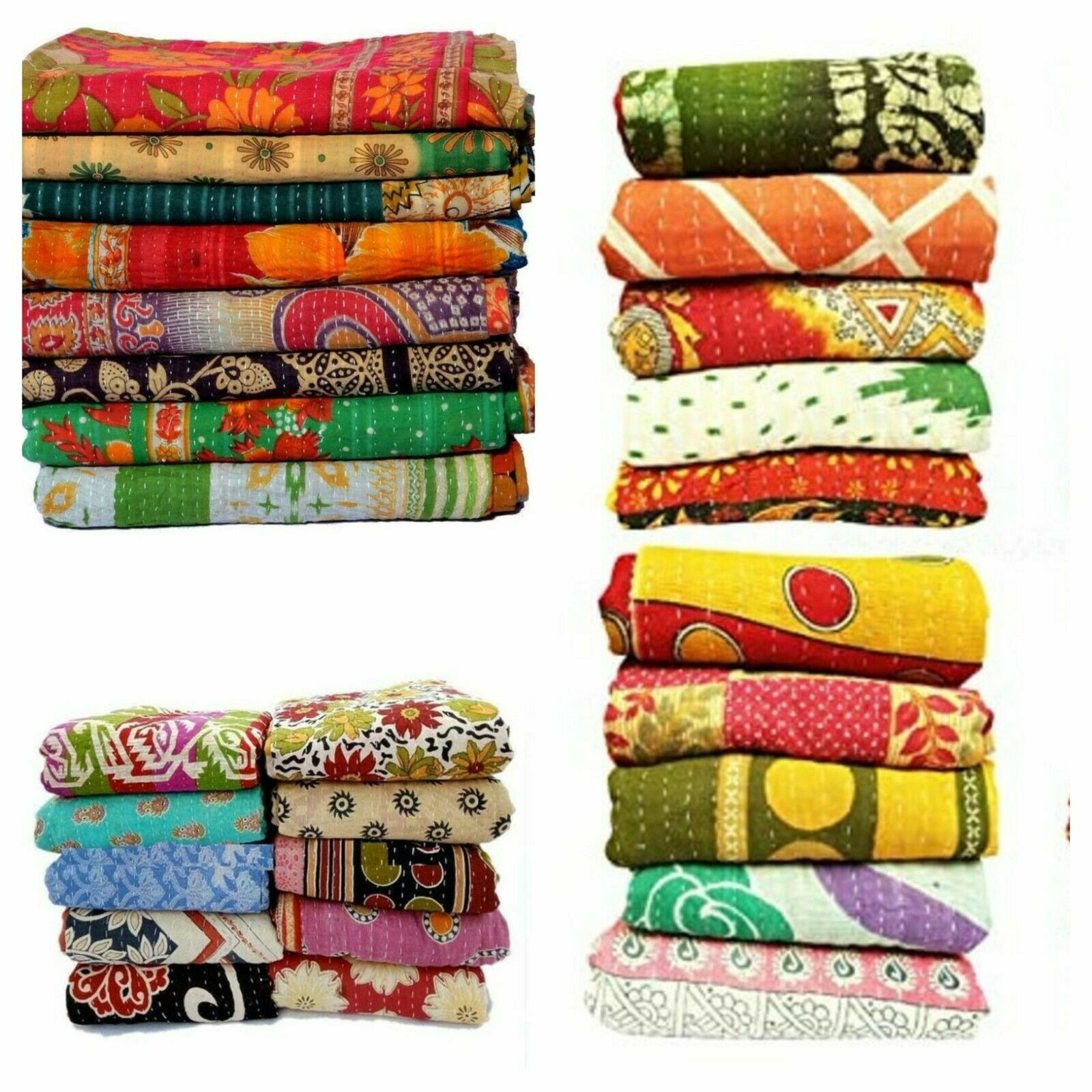 This Vintage Throw Kantha Quilt is made of 100% Old Cotton Recycled Fabric with three layers of sarees to provide it Traditional and Vintage look with thousands of small and delicate Fine Kantha stitches hand crafted softly quilted by artisans in India. The way in which the stitches have been done makes the quilt extraordinary.