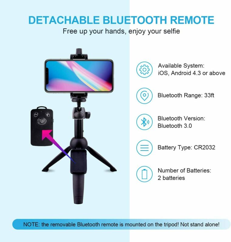 【Fast-to-Connect Detachable Bluetooth Wireless Remote】Never need to grasp the selfie stick when taking group photos. Wireless remote control is featured by fast connection speed, low cost, long service life and 10m/33ft control range (Note: Just for high-quality 60mAh battery of mobile phones and Bluetooth cameras). Charge the Bluetooth remote control via micro USB. after 45-60 minutes fully charging.