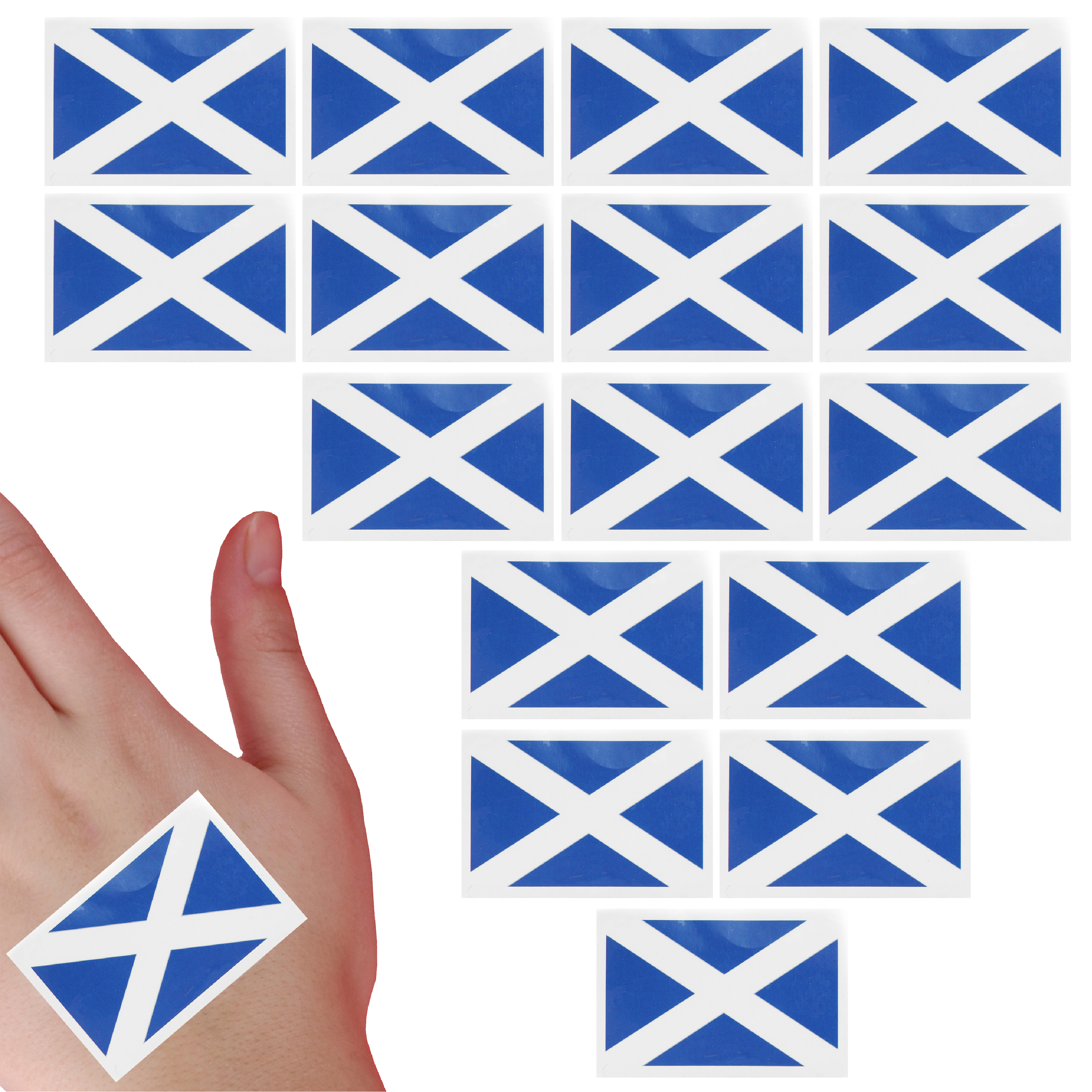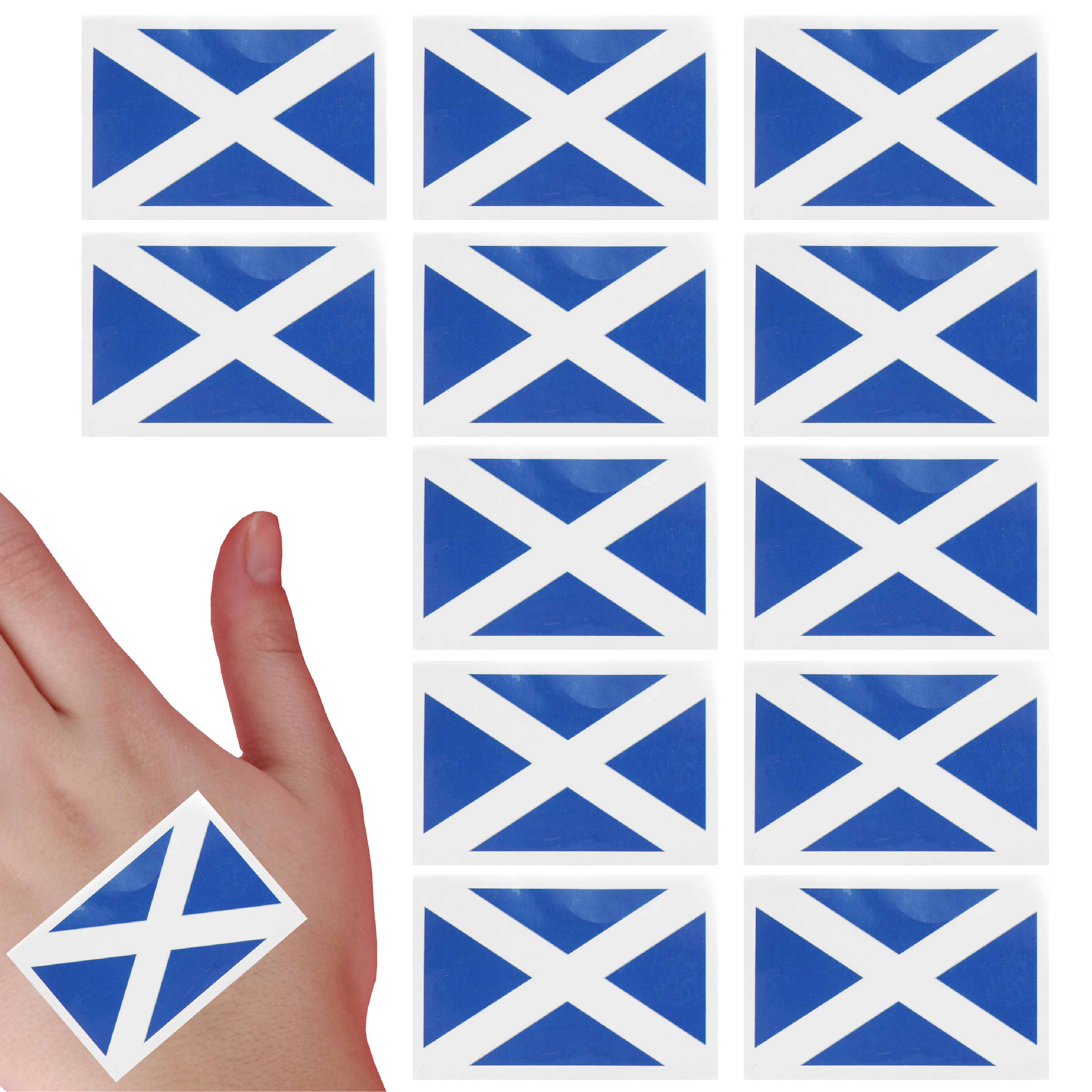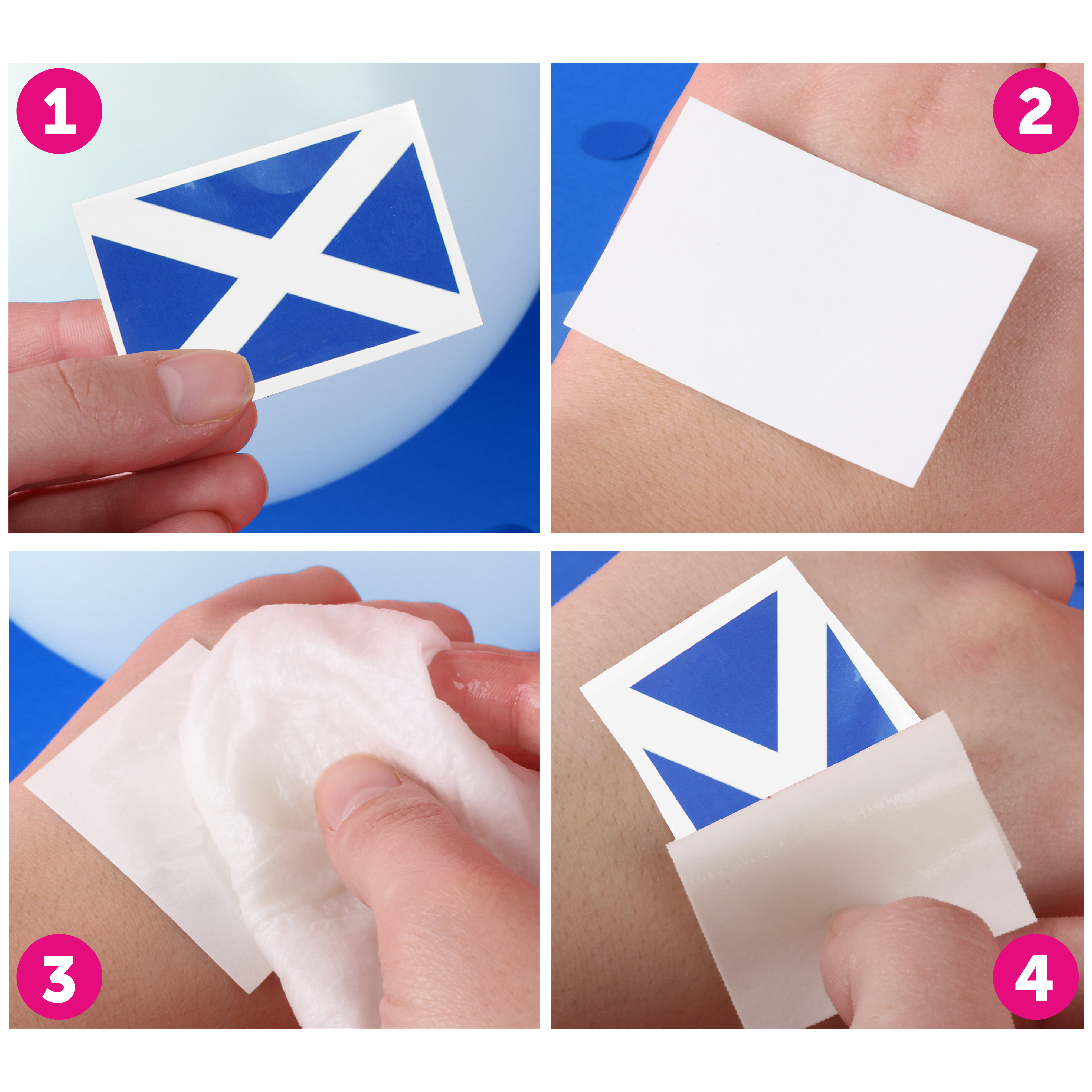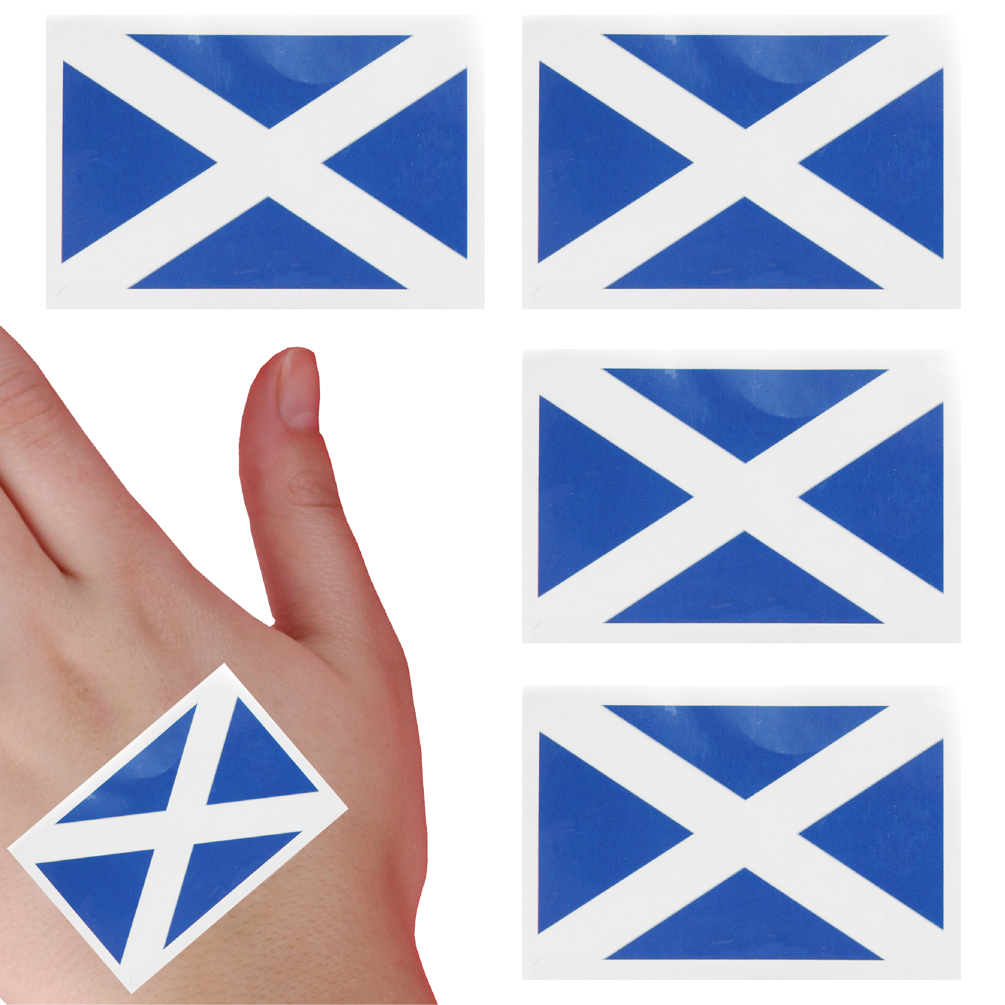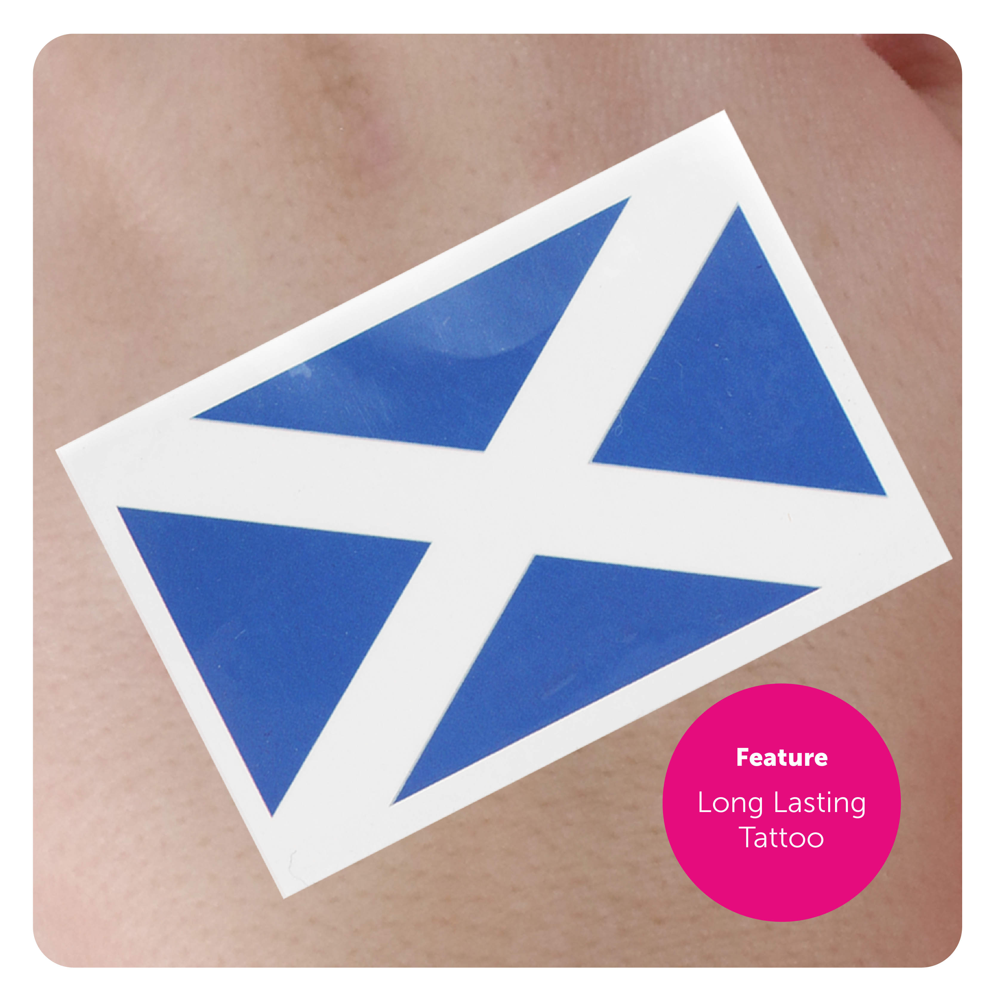 SCOTTISH FLAG TATTOO DETAILS: Your Scottish Flag Tattoos come in Packs of 4, these temporary press-on Scotland tattoos are durable for 1 week, each Tattoo is 6.5cm x 5cm, a perfect size and durability to celebrate Scotland all week long!