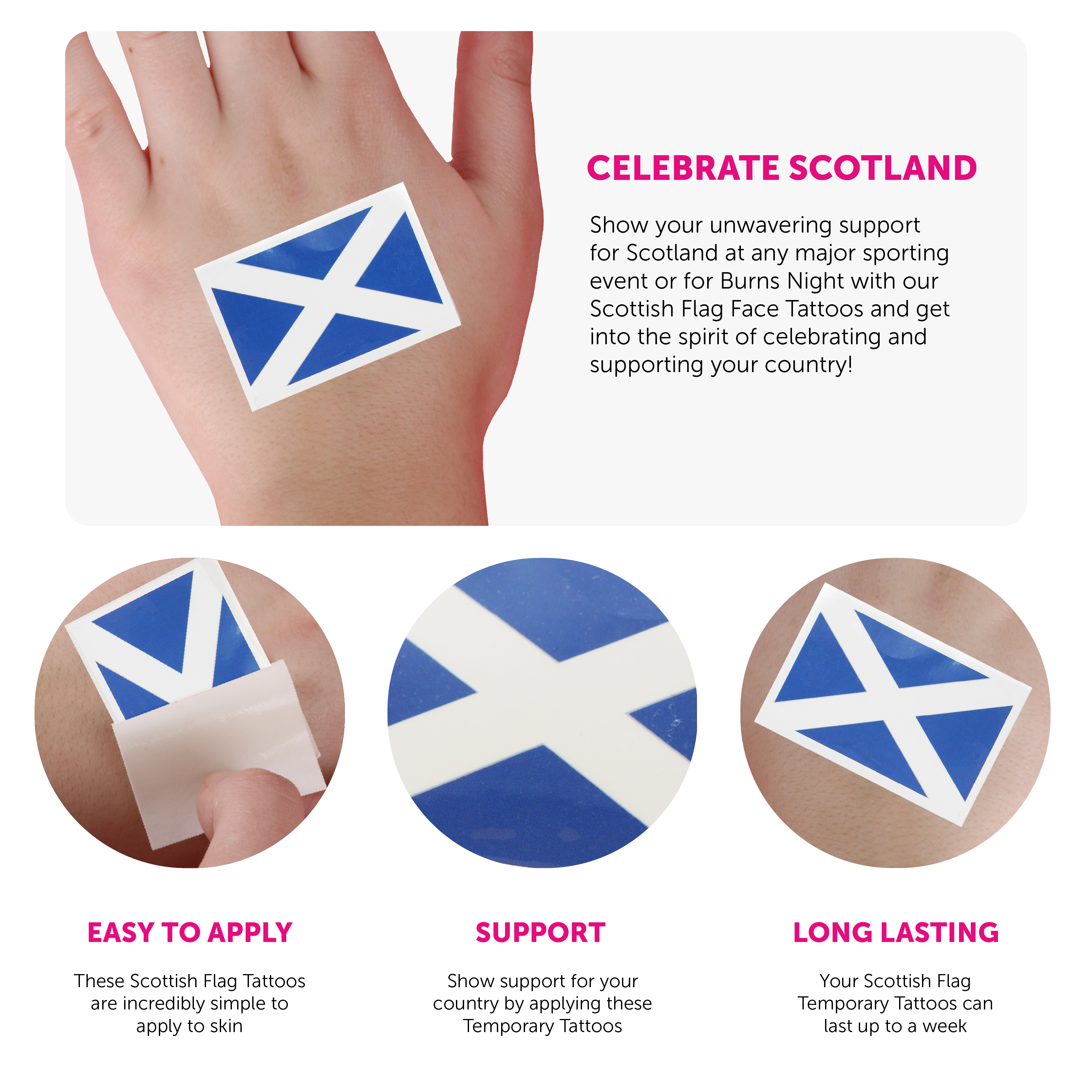 SCOTTISH FLAG FACE TATTOOS: Show your unwavering support for Scotland at any major sporting event or for Burns Night with our Scottish Flag Face Tattoos and get into the spirit of celebrating and supporting your country!