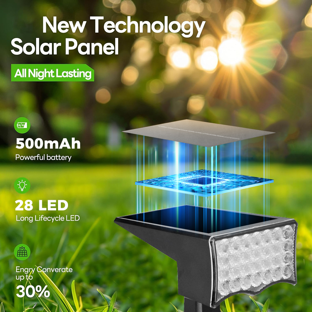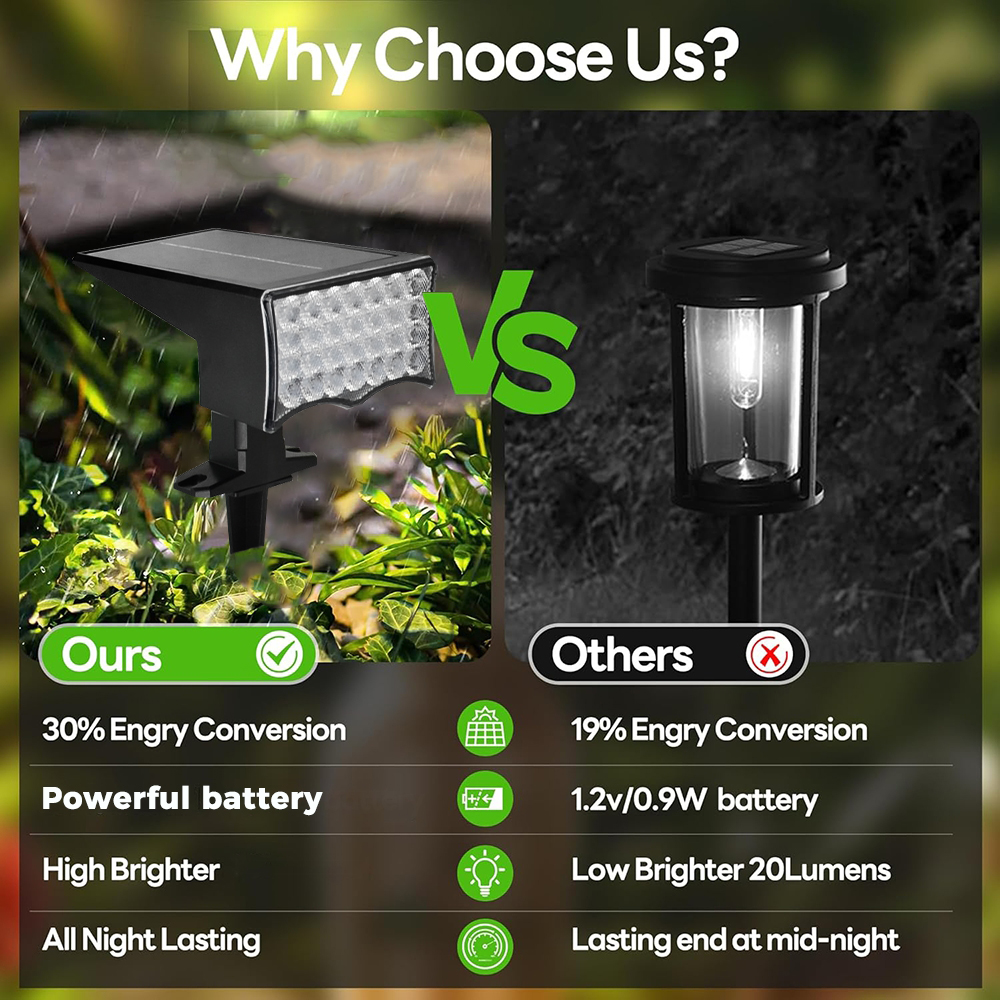Super Bright Solar Spotlights: Equipped with 28 high-intensity LED beads, these solar spot lights deliver exceptional brightness—outshining traditional solar outdoor lights. Perfect for enhancing your backyard, garden, driveway, walkway, trees, fences and more.