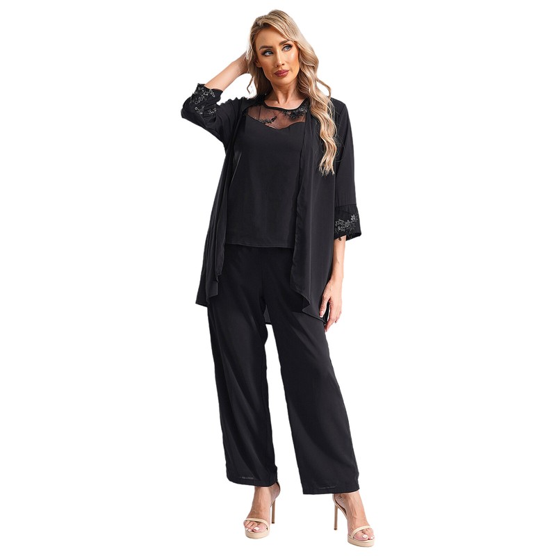 Hosenanzug Damen Abendanzug Set 3-teilige Chiffon Weste Cardigan und Hose Outfit