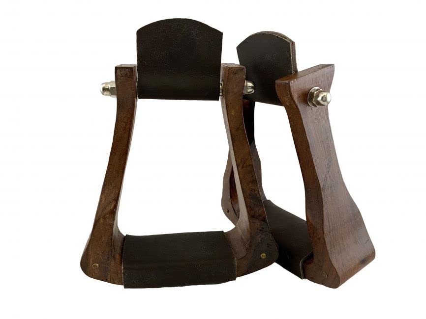 Showman Teak Wood Stirrups w/ Leather Tread. These medium color teak wood stirrups feature a chocolate leather tread. Measurements: 3" Neck, 5" Width & 2" Tread. Sold in pairs.
