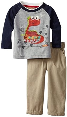 A raglan style long-sleeved shirt in gray and navy blue. A cute baby Dinosaur graphic/applique on the front. Of a soft 56% cotton, 44% polyester. Easy pull-on style pants in khaki/light tan with a full elastic waist. Faux zipper flap, two front pockets and two back. Of a medium-weight 100% cotton fabric. Size 18 Months