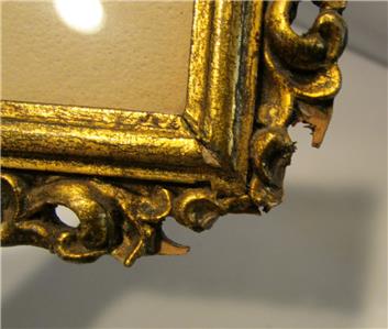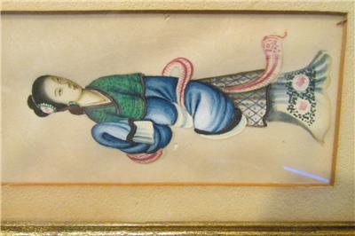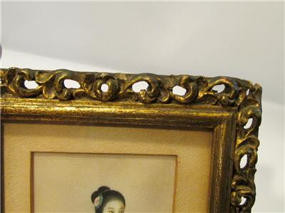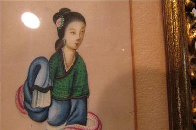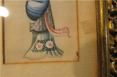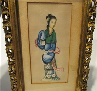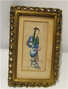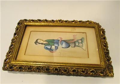 The colors are beautiful on this lovely Asian art that I believe is painted on rice paper. The frame is all wooden, and has a corner missing (see pic). This piece is old, age unknown, and is not signed that I can find. I have not removed it from the frame. Measures 8.5" x 5.5"