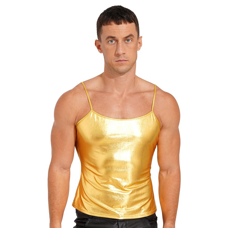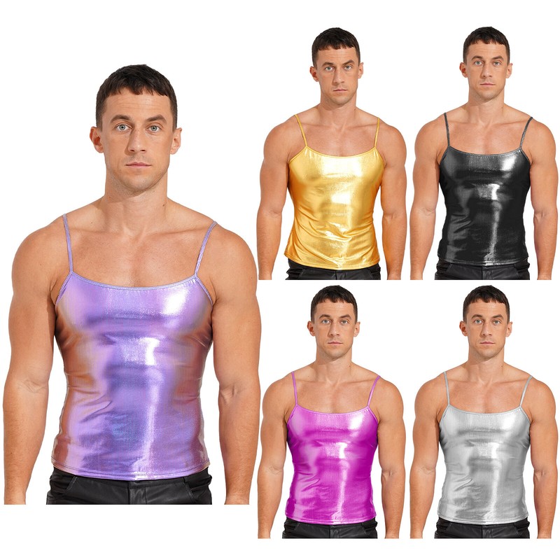 Men's Glitter Patent Leather Tank Top Stretchy Top Dance Fitness Muscle T-Shirt