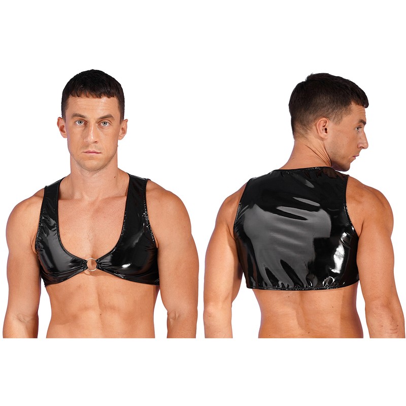 Men’s metallic shiny faux leather crop tank tops, pull on closure.
