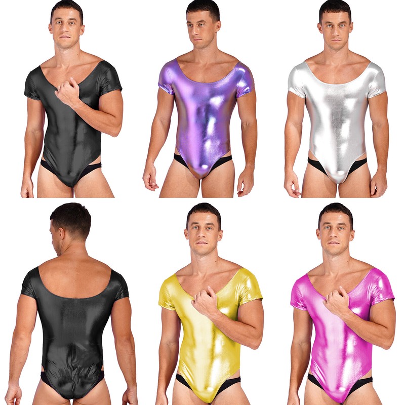 Men's Metallic High Cut Dance Leotard Bodysuit Crossdresser One Piece Nightwear
