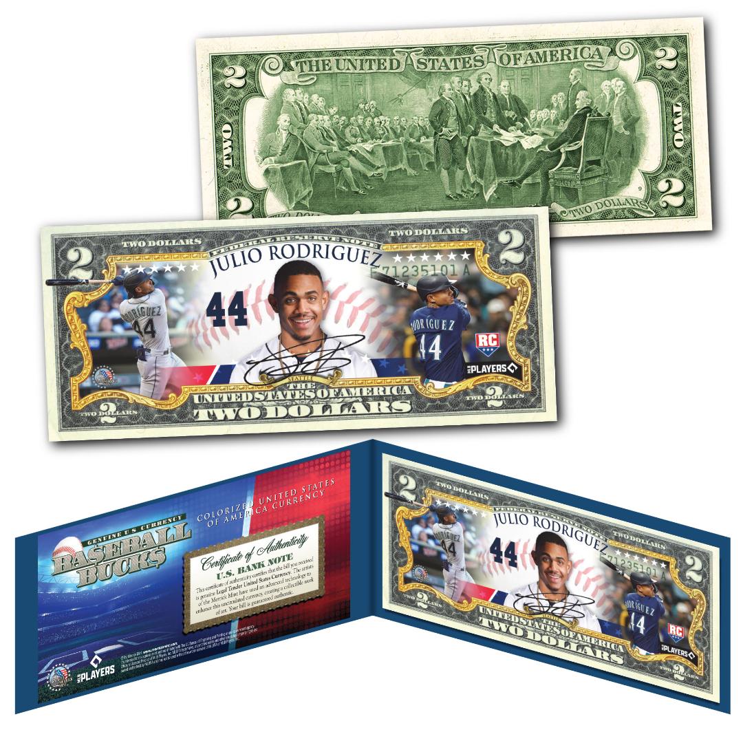 Introducing Baseball Bucks, the ultimate collector's item for baseball enthusiasts! The officially licensed Baseball Bucks Genuine Legal Tender U.S. $2 Bill combines the timeless appeal of U.S. currency with the excitement of Major League Baseball. Featuring stunning colorization of your favorite baseball players, this unique product is a must-have for fans and collectors alike. Product Features: Officially Licensed: Our Baseball Bucks are officially licensed by Major League Baseball, ensuring authenticity and quality. Each bill is backed by the authority of the United States government, making it a genuine legal tender U.S. $2 bill. These are genuine legal tender U.S. $2 bills that hold both collector and monetary value. Colorized Design: Unlike ordinary currency, Baseball Bucks are expertly colorized to showcase vibrant and lifelike depictions of renowned Major League Baseball players. Celebrate your favorite teams and players in a truly unique way. The vivid colors bring the excitement of the game right into your hands. Limited Edition: Baseball Bucks are produced in limited quantities, adding to their collectible value. Don't miss your chance to own a piece of baseball history and showcase your passion for the game. Protected Display Case: Each Baseball Buck comes in a protective display case, allowing you to showcase and preserve its pristine condition. The clear casing ensures the bill remains safe from dust, fingerprints, and other potential damage. Authenticity Certificate: With every purchase of Baseball Bucks, you will receive an authenticity certificate, verifying its genuine legal tender status and officially licensed MLB design.