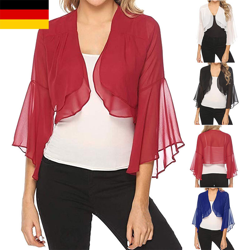 Solide Damen-Chiffon-Strickjacke mit offenen Glockenärmeln, kurzen Achselzucken, Bolero-Tops, Accessoire für Büropartys.
