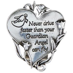 Never drive faster than your Guardian Angel can fly." The heart shaped visor clip securely attaches to your car's visor to remind you to be a safe driver. The never drive faster visor clip is a great gift for new drivers!