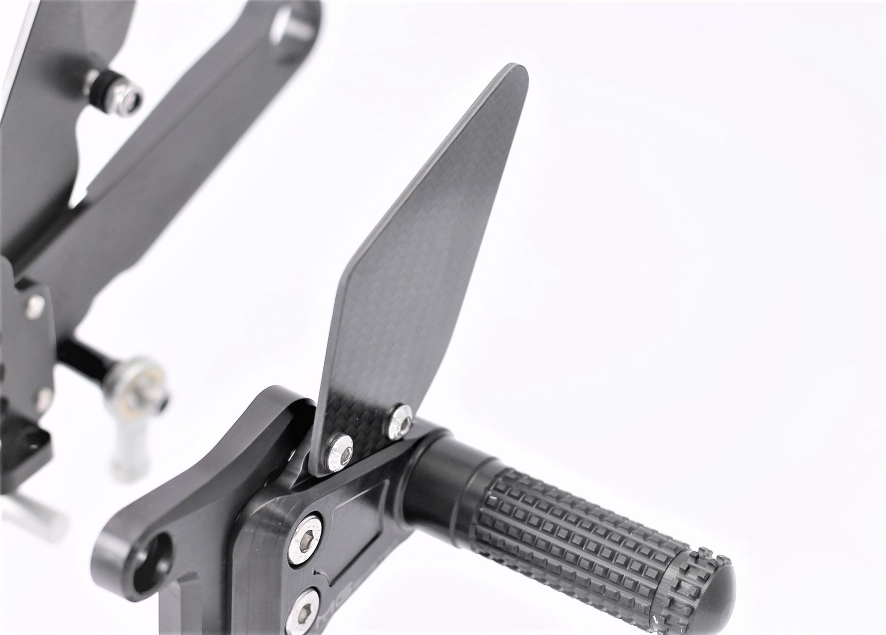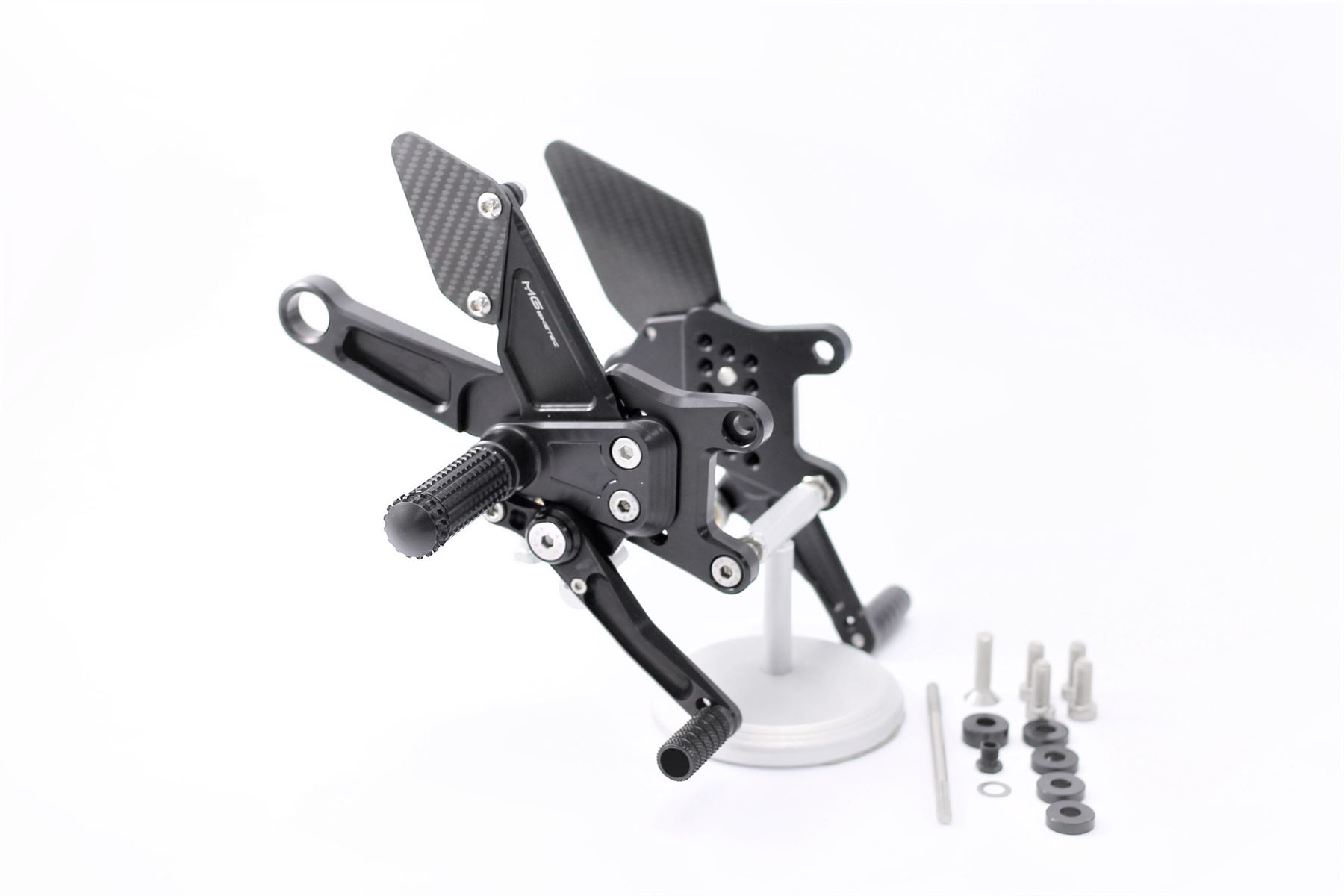 The MG Biketec rearset kits are CNC machined from high quality 7075 aluminium and are then hard anodised for durability. They are fully adjustable with multiple footpeg and toepeg positions and supplied with carbon heelguards. Supplied with folding footpeg adapters, which can be locked in a fixed position for increased control if required.