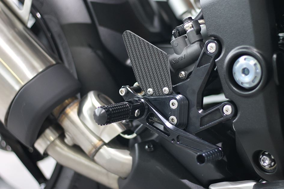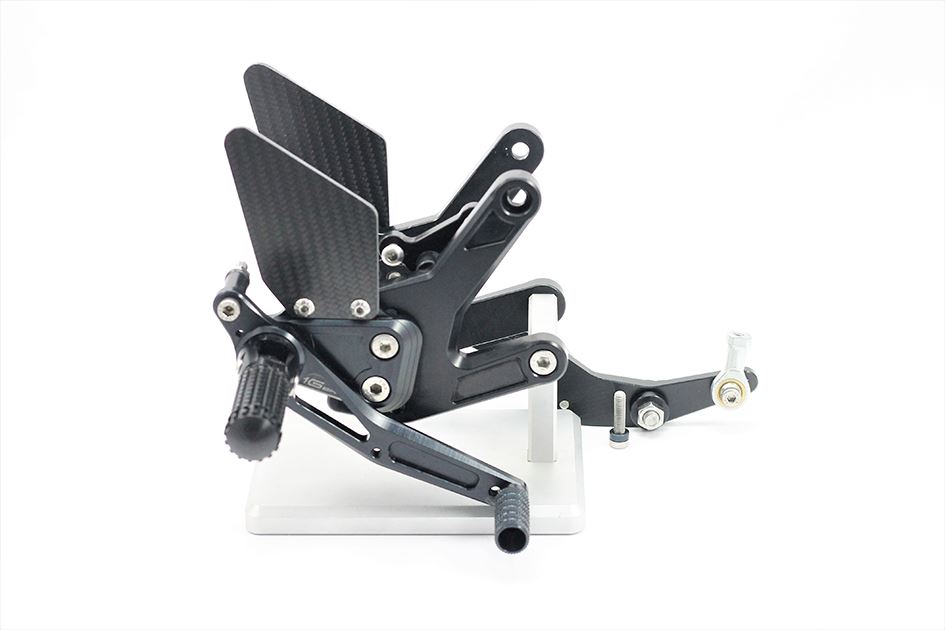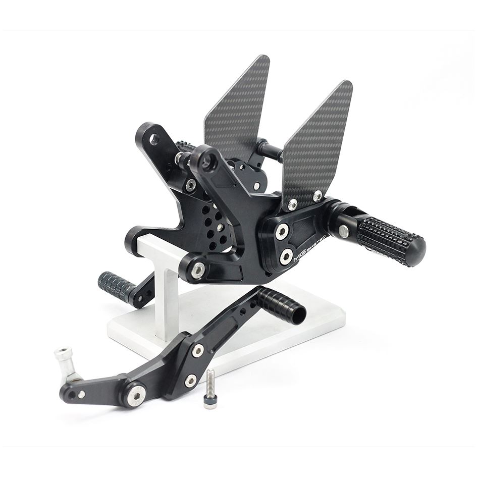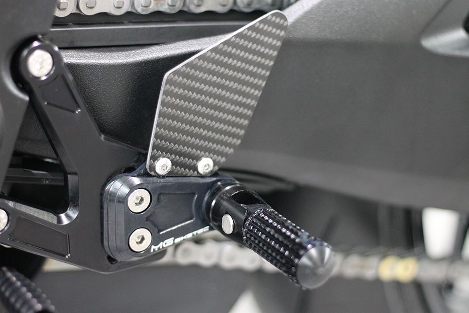 The MG Biketec rearset kits are CNC machined from high quality 7075 aluminium and are then hard anodised for durability. They are fully adjustable with multiple footpeg and toepeg positions and supplied with carbon heelguards. Supplied with folding footpeg adapters, which can be locked in a fixed position for increased control if required.