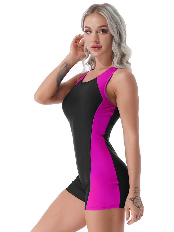 Women U Neck Straps Cross at Rear Color Contrast Short Jumpsuit Swimming Suit.