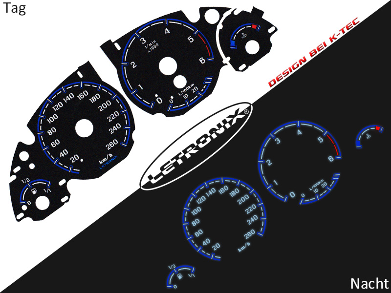 Mit unseren selbstleuchtenden Letronix Plasma Tachoscheiben im schwarzen Design (Design by K-Tec), verleihen Sie Ihrem Tacho eine individuelle und exklusive Optik. Die Tachoscheiben werden einfach gegen Ihre originalen Tachoscheiben ausgetauscht und der beiliegende Inverter wird dann an Plus und Minus angeschlossen.