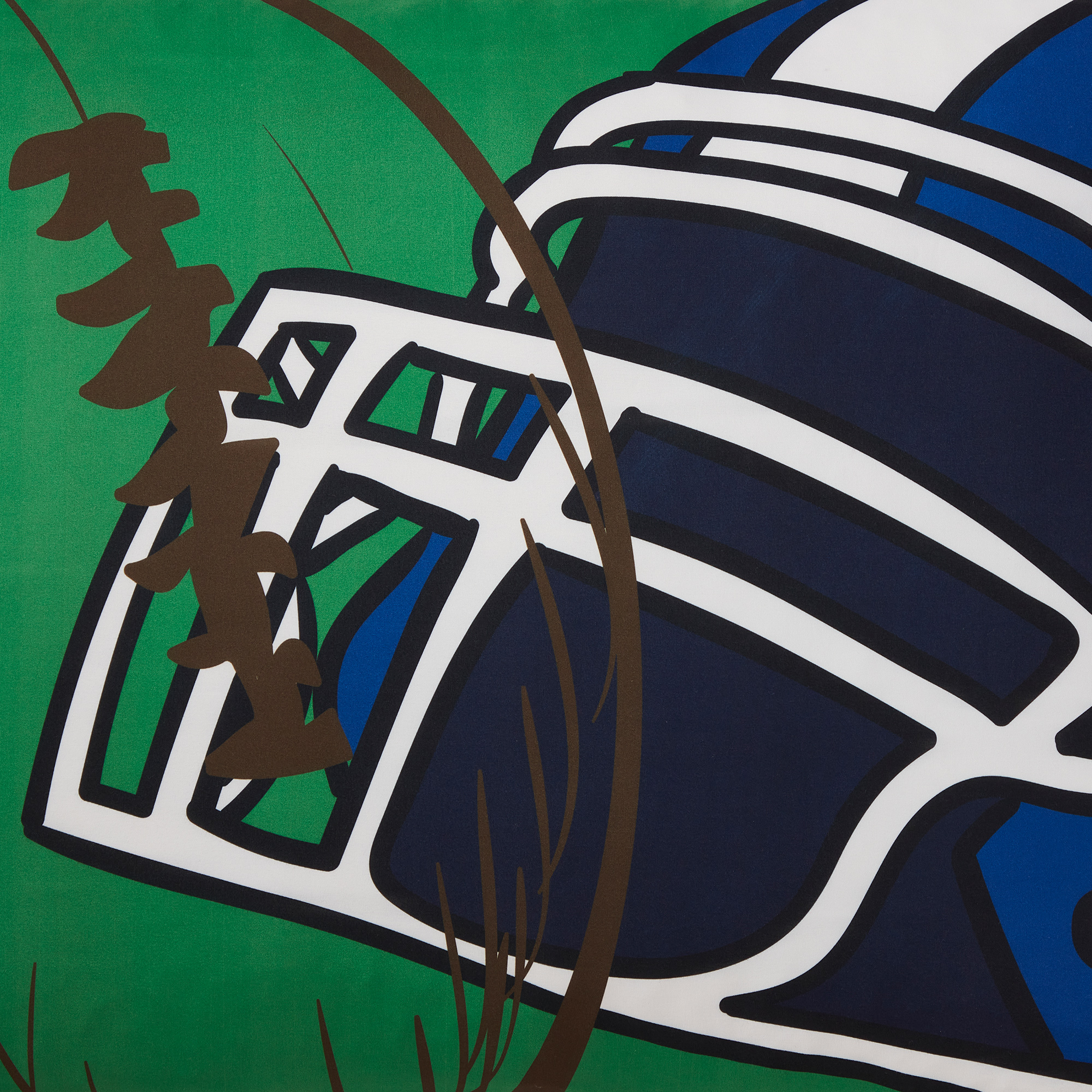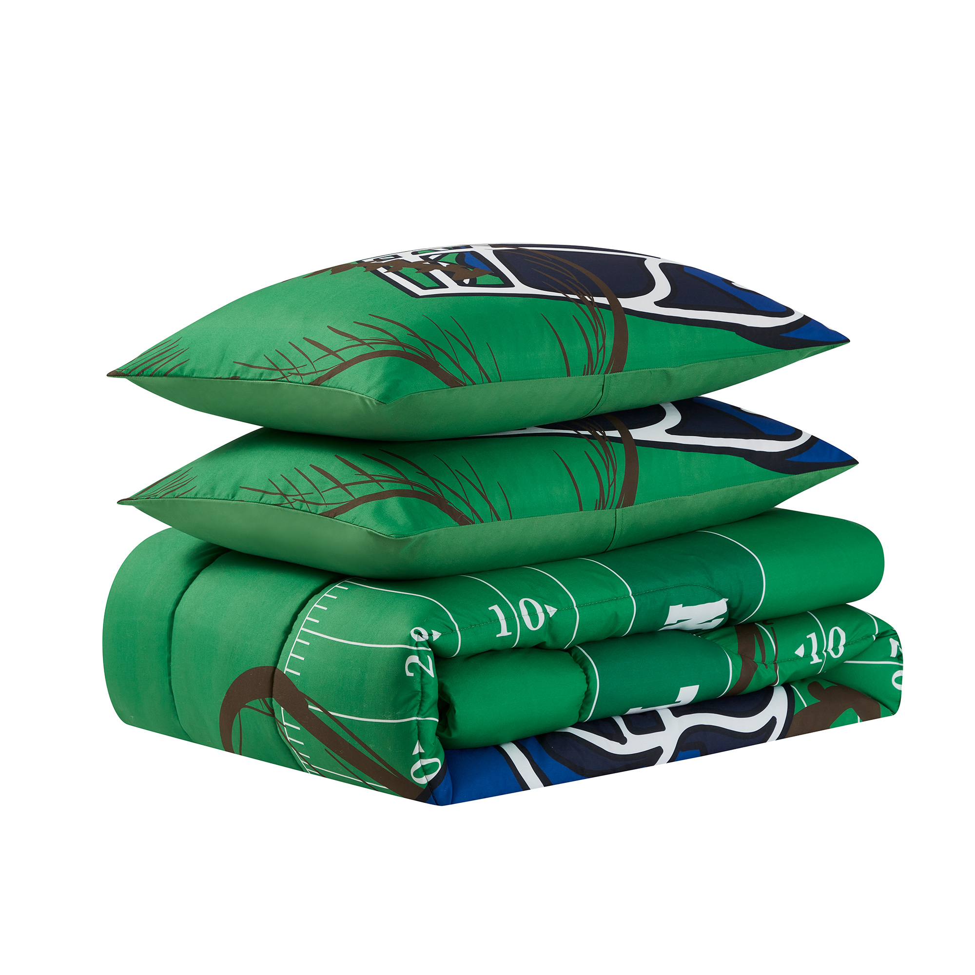 Your little ones can dream about making the game winning touchdown while sleeping in our Football themed Comforter and Sheet Set. Featuring a Green football field and blue helmet design and double brushed microfiber construction, they’ll love to sleep in this ultra soft comforter and sheet set. With the set you will get a 100% Polyester Microfiber & Down Alternative football print comforter with matching pillow shams, and a gorgeous white sheet set with footballs and helmets that will dress up your childs bed without breaking the bank.