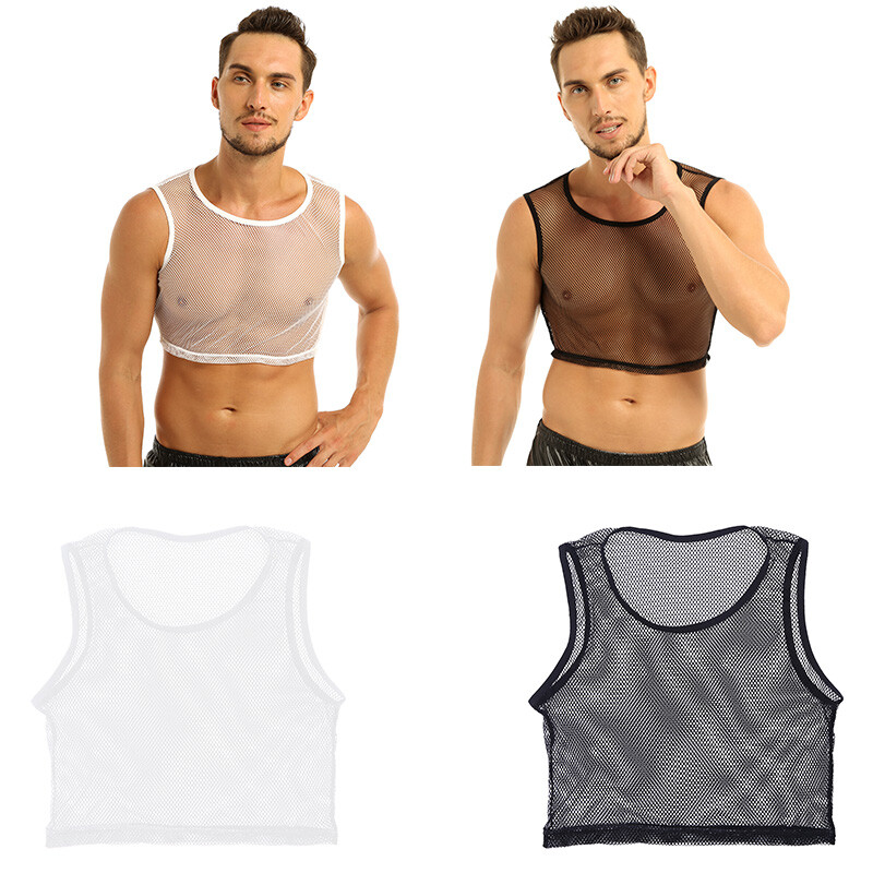 Man Hollow Out See-through Net Round Neck Wide Shoulder Straps Sleeveless Sport Vest.