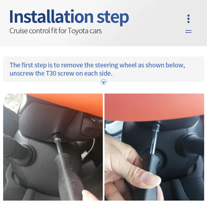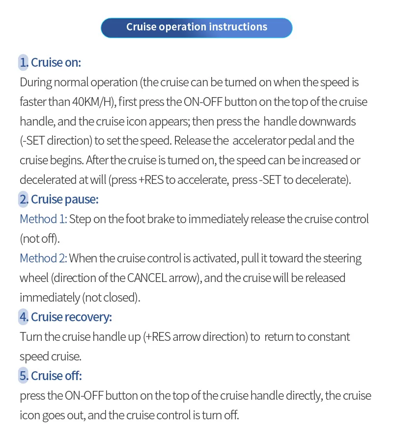 1. When car speed over 40km/h, press on/off switch to turn on/off cruise function, once turn on the cruise function, the LED indicator will turn on, press the handle to (- SET) direction, release the foot on accelerator pedal. The cruise control is turn on. Press up the handle will accelerate and press down will decelerate the speed.