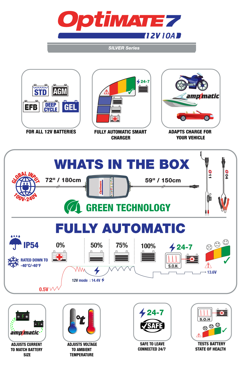 Optimate 7 Ampmatic, TM-255v2, 9-Step 12V 10A Sealed Battery Saving Charger & ma