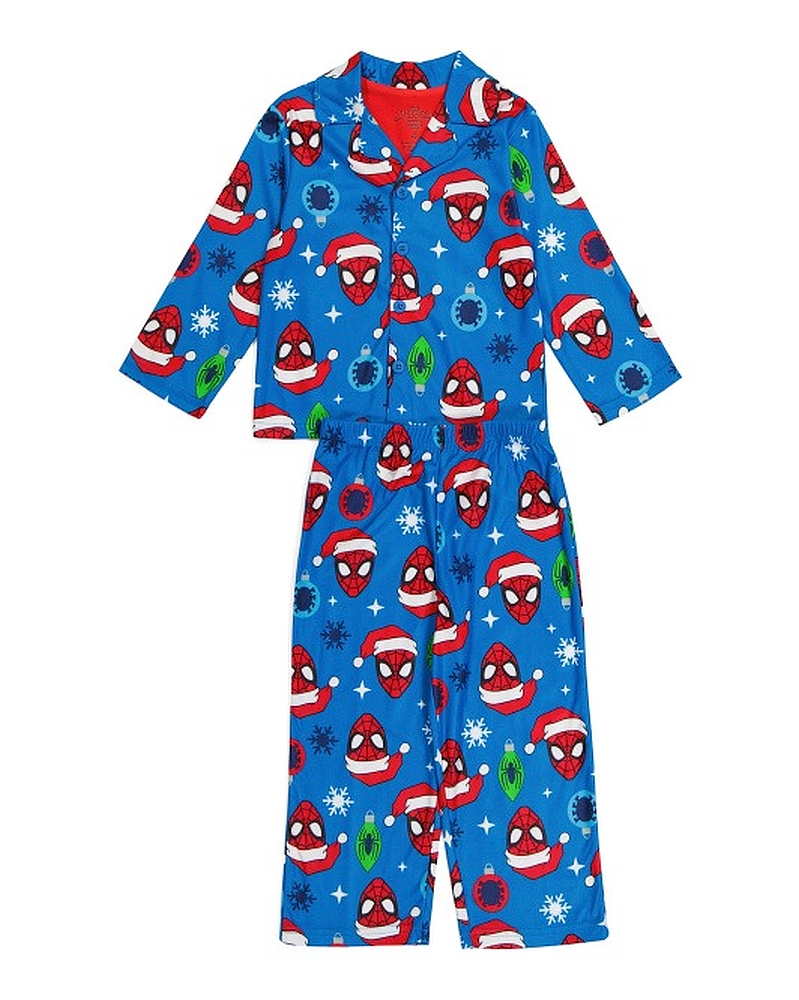 The set features a colorful and fun Christmas-themed print with 'Santa Spidey', Spider-themed decorations, and snowflakes. A coat-style pajama top with blue buttons fully down the front. An elasticized waistband on the coordinating pajama pants lends a custom fit. Of a soft and cozy polyester flannel fabric.