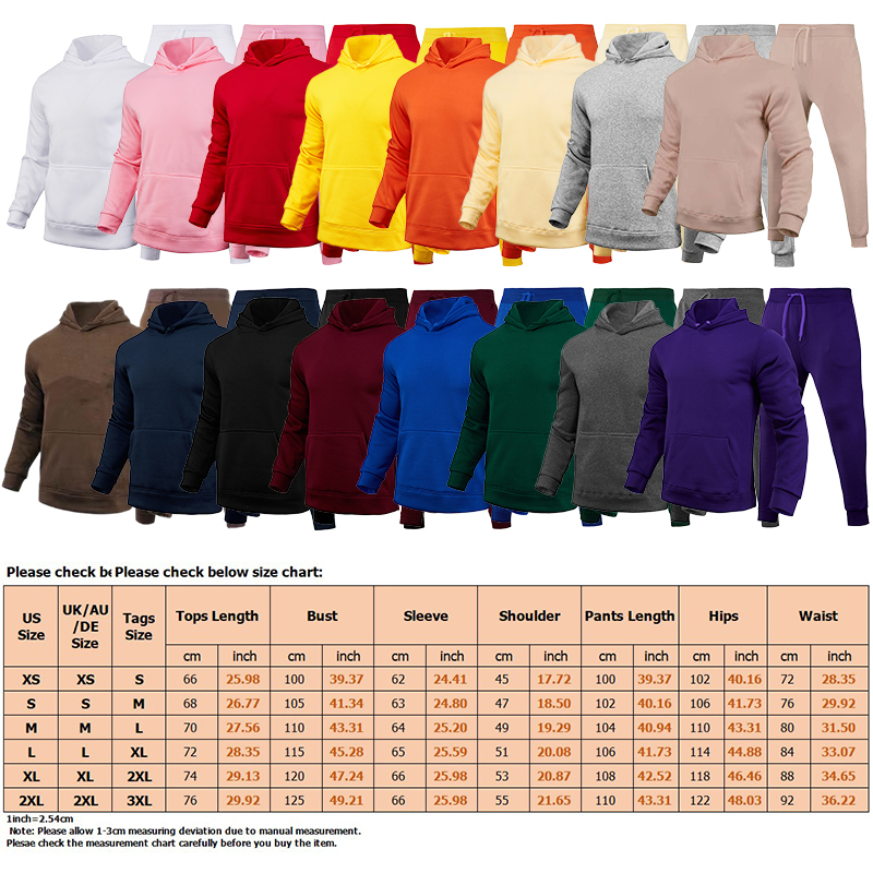 Gender: Men, Man, Boys Style: Men 2 Piece Outfits, Men Casual Athletic Sweatsuits, Men Hoodies and Sweatpants, Men Sport Tracksuits Jogger Sets Pattern Type: Solid Color Color: Black, Camel, Light Gray, Navy Blue, Red, Blue, Yellow, Wine Red, Purple, Green, Orange Red, Dark Gray, Khaki, Pink, White, Coffee Size: S, M, L, XL, 2XL, 3XL Material: 95% Polyester 5% Spandex Neckline: Hooded Top Length: Hips Pants Length: Long Sleeve Length: Long Sleeve Season: Spring, Autumn, Winter Features: 1. TYPE: Men's 2 piece sports tracksuit casual long sleeve jogging sweatsuit hoodie suit sets running walking athletic outfits outdoor wear sets 2. FEATURES: 2 piece tracksuit for men, hoodies: solid color, long sleeves, pockets, elastic waistband hoodie. Pants: delicate waist elastic design with drawstring, easy to put on. This sports suit set made of polyester material, soft and comfortable to wear. Good stitching, maintain high performance in sports . 3. OCCASION: Great for sports wear, daily wear, everyday casual wear, workwear, going out, outdoor, streetwear, dating, campus etc, special gifts for yourself, friends and so on. Package Content: 1 x Hooded Sweatshirt 1 x Sweatpants Tips: 1. Please compare the detail sizes with yours before you buy!!! 2. Colors may be slightly different depending on computer and monitor settings. 3. Please allow 1-3cm differs due to manual measurement, thanks. (All measurement in cm and please note 1cm=0.39inch, 1inch=2.54cm)