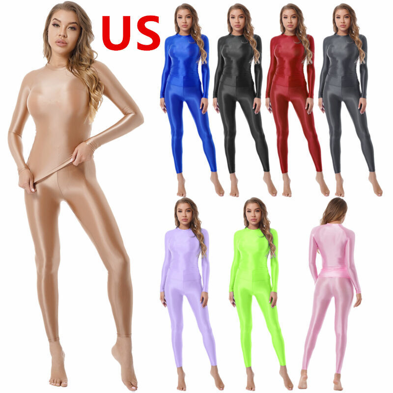 Glossy appearance, solid color, high waist with wide waistband for comfy fit.