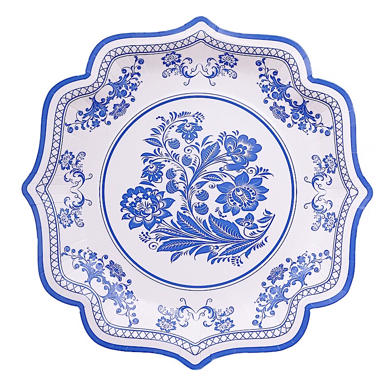 25 White 10" Paper Dessert Plates Blue Floral Print Scalloped Rim