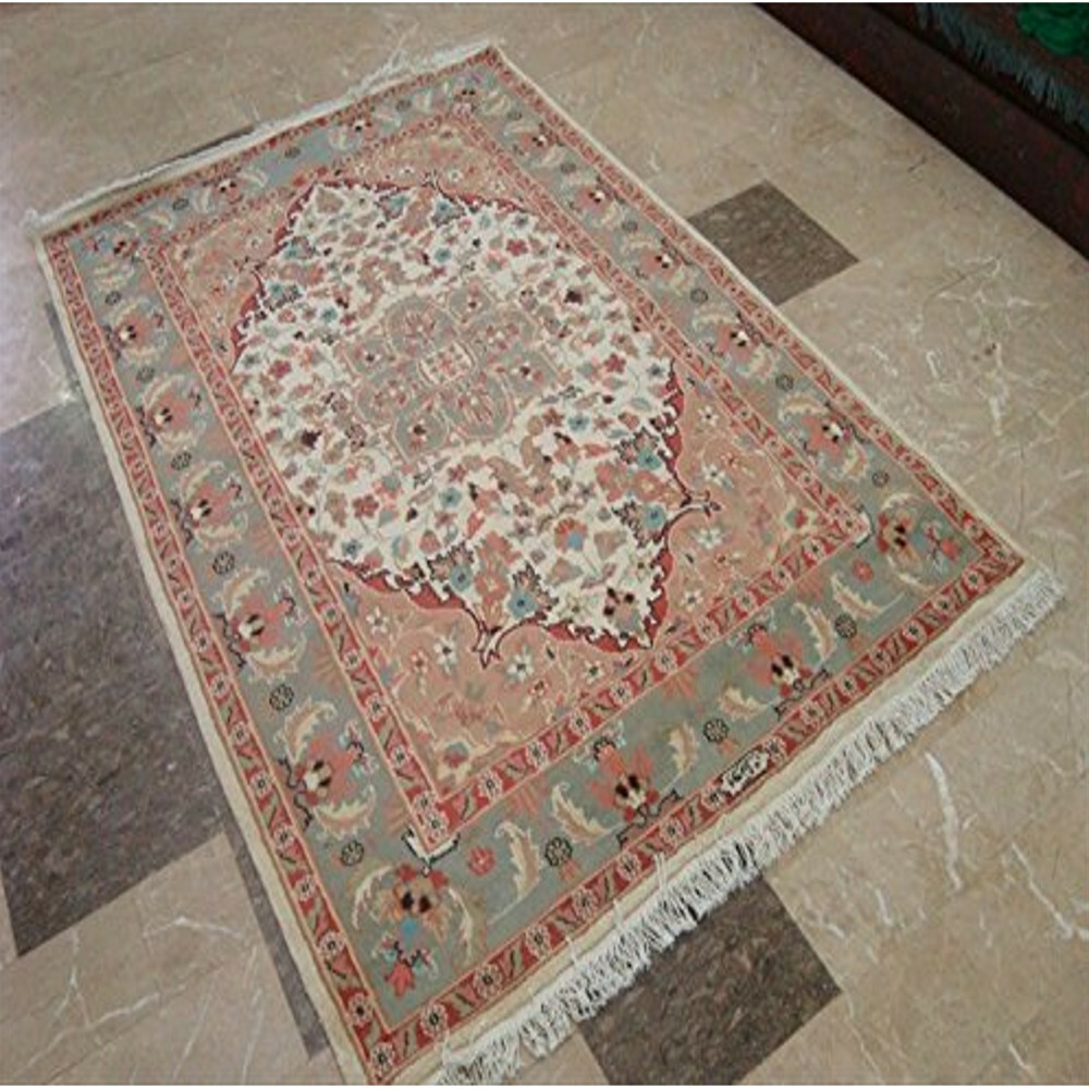 Ivory Medallion Flowers Exclusive Hand Knotted Rug Wool Silk Carpet (6 x 4)'. The rug to appear dull when viewed from one side, and shiny from the other side. Please view the picture at the bottom to see the bright side of the rug. This rug can help brighten up a room if you do not get much sunlight. Simply put the bright side facing the seating area and it will make the room appear surprisingly bright. Gorgeous flower med design with Ivory and multi-color, sure to catch your attention. This rug is easily compatible with most home decor. Blended color schemes match well with all styles of furniture and art. Give your home an elegant touch with this area rug. Great for any decor, adds texture to the floor and complements any decor. 100% Genuine Hand Knotted-Rug not hand tufted .