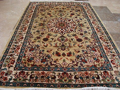 Beige Ivory Medallion Flower Lovely Area Rug Hand Knotted Wool Silk Carpet (6 X 4)'. For the perfect combination of unique, beautiful style and high-quality durability, the attention to detail on these beautiful contemporary rugs is noticed as soon as you lay eyes on the carpet. The rug to appear dull when viewed from one side, and shiny from the other side. Please view the picture at the bottom to see the bright side of the rug. This rug can help brighten up a room if you do not get much sunlight. Simply put the bright side facing the seating area and it will make the room appear surprisingly bright. Rectangle shape with excellent floral pattern. Ideal choice for the modern family room. Blended color schemes match well with all styles of furniture and art. Give your home an elegant touch with this amazing rug carpet. Great for any decor, adds texture to the floor and complements any decor. 100% Genuine Hand Knotted-Rug not hand tufted.