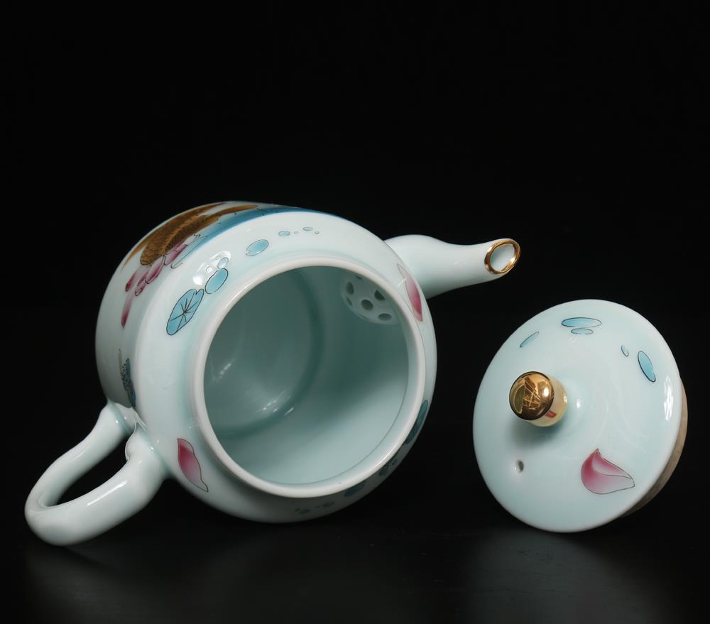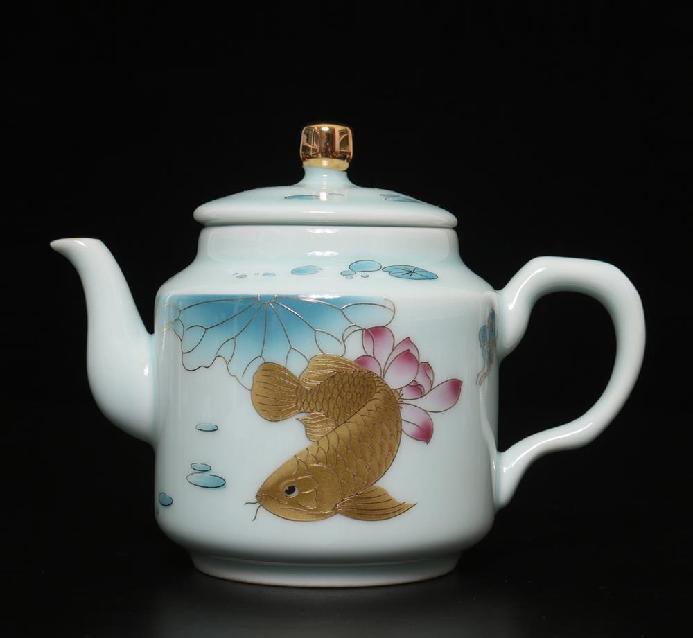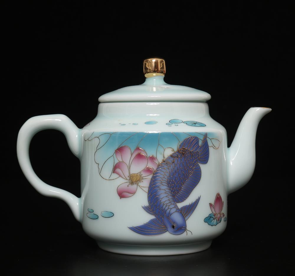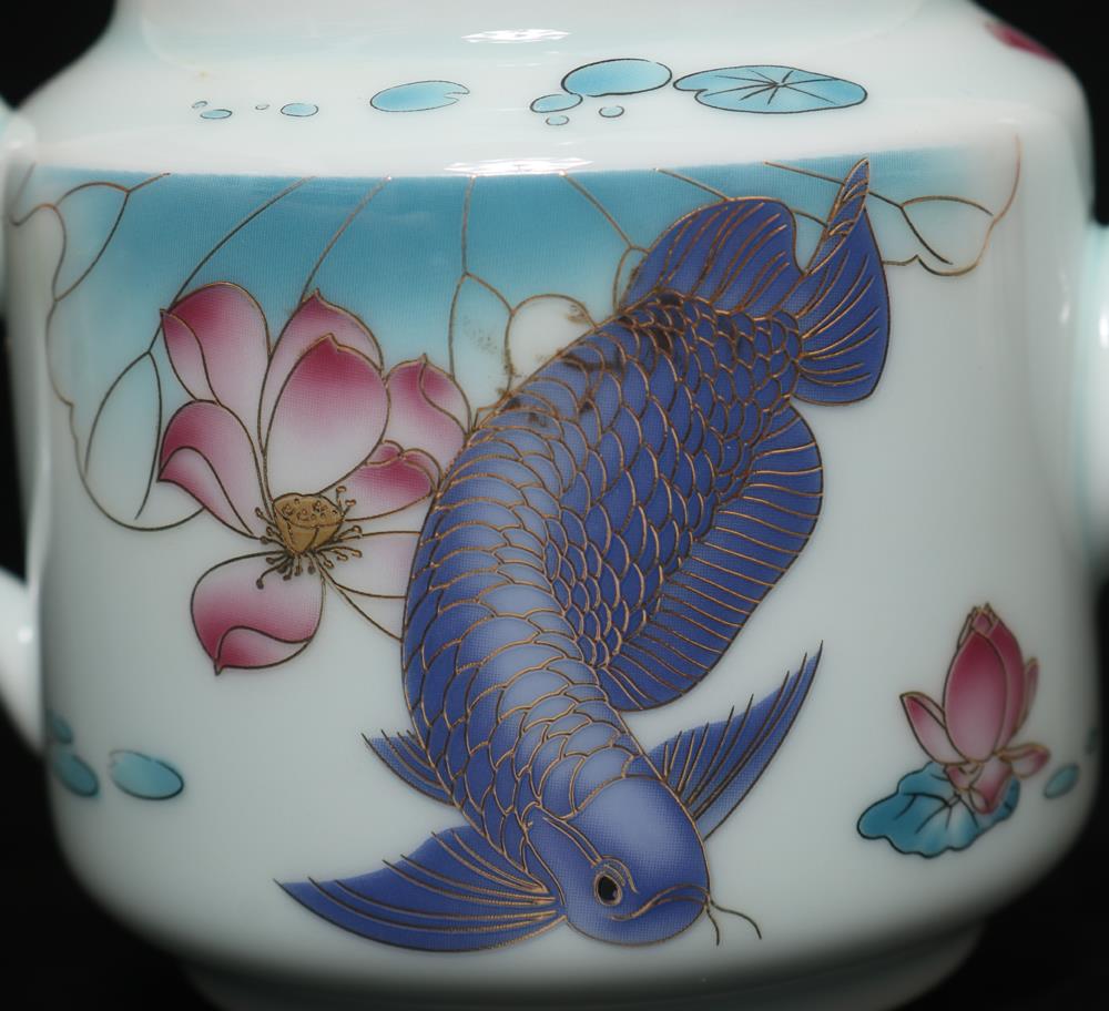 Description - Chinese porcelain teapot, decorated with fish, Underglaze mark on base.