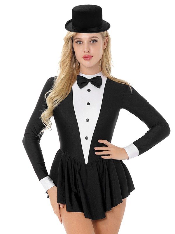 Long sleeve tuxedo dress for women, contrast color design, bowknot and buttons decoration. Pair with a felt hat.