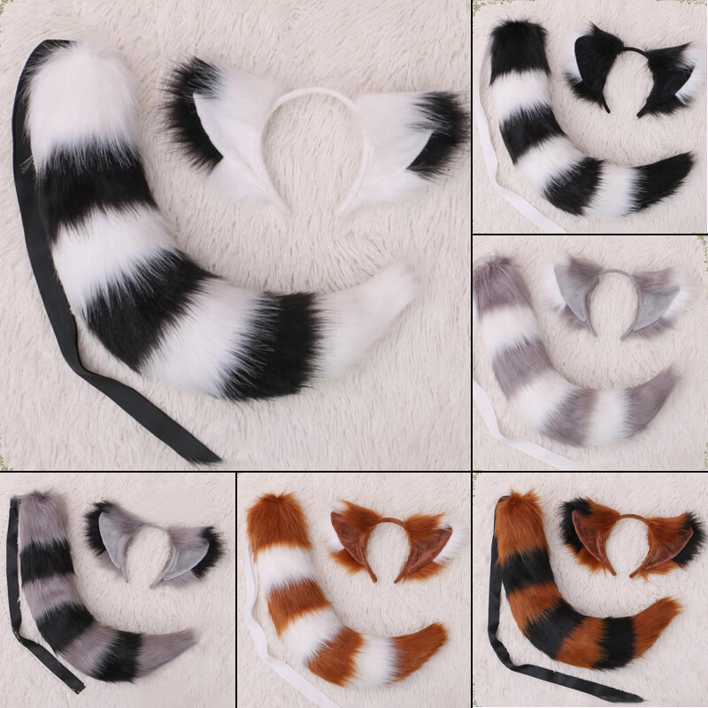 60cm Anime Wolf Fox Ear with Tail Set Plushly Headwear Party Cosplay Prop White