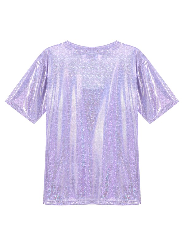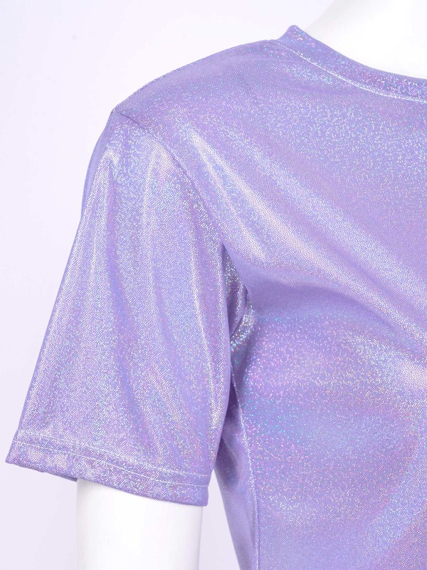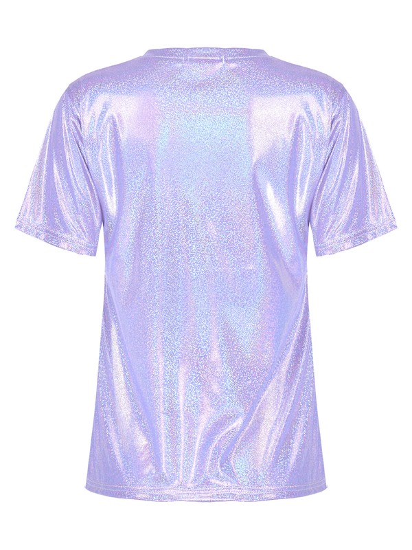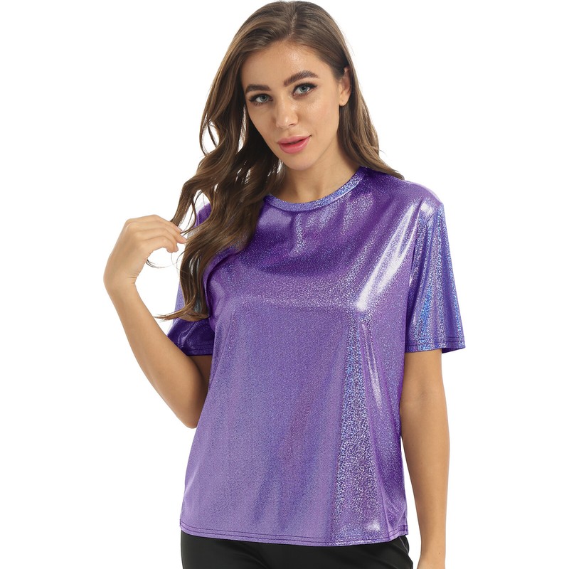 Womens Fashion Shiny Short Sleeve T-Shirt Casual Sparkling Round Neck Tops.