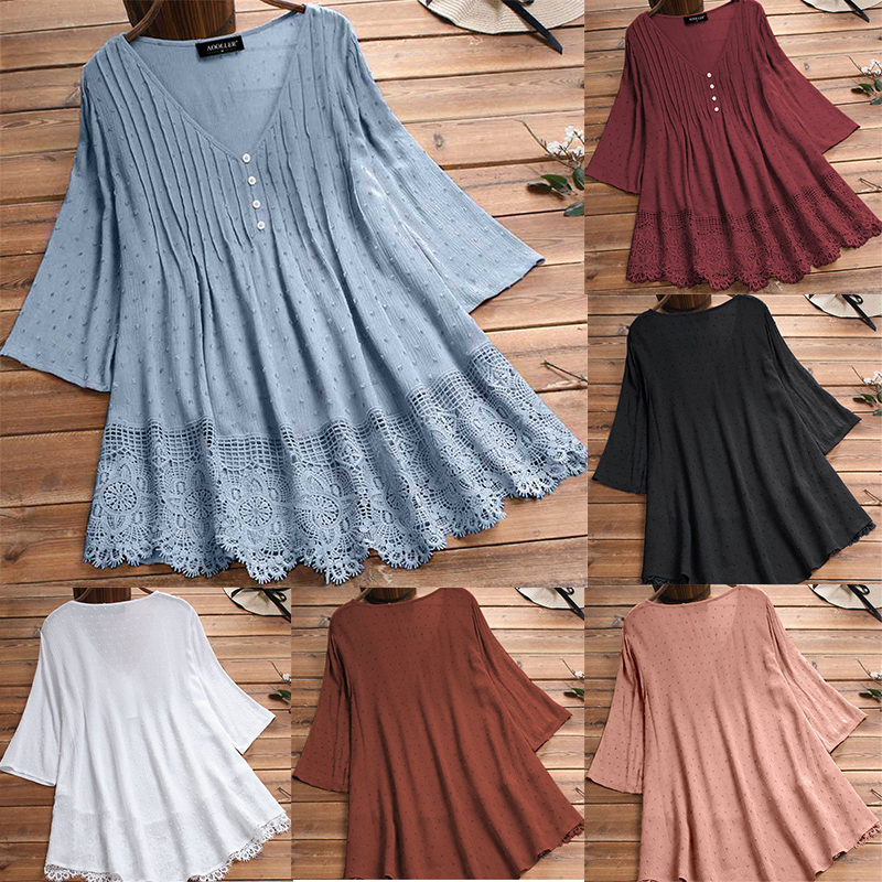 Casual T Shirt V Lace Long Sleeve Blouse Womens Summer Pullover Loose Tops