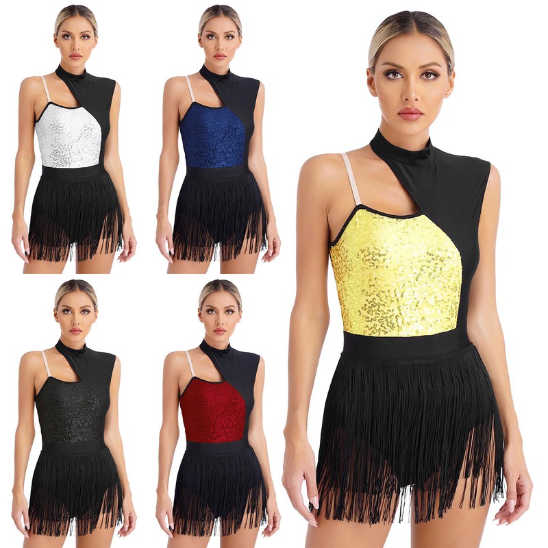 Womens Dancewear Sequins Dress Fringed Leotard Cha-Cha Latin Samba Dance TangoUSD 7.99