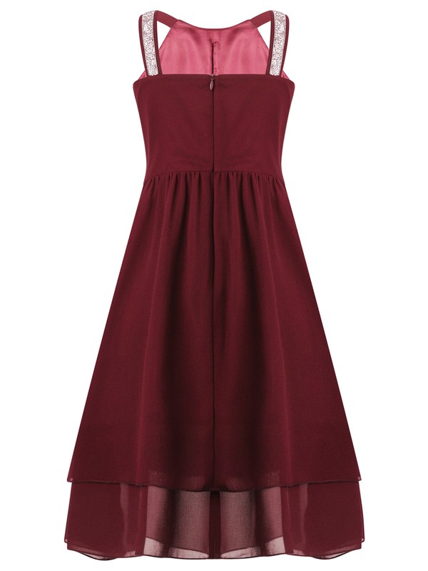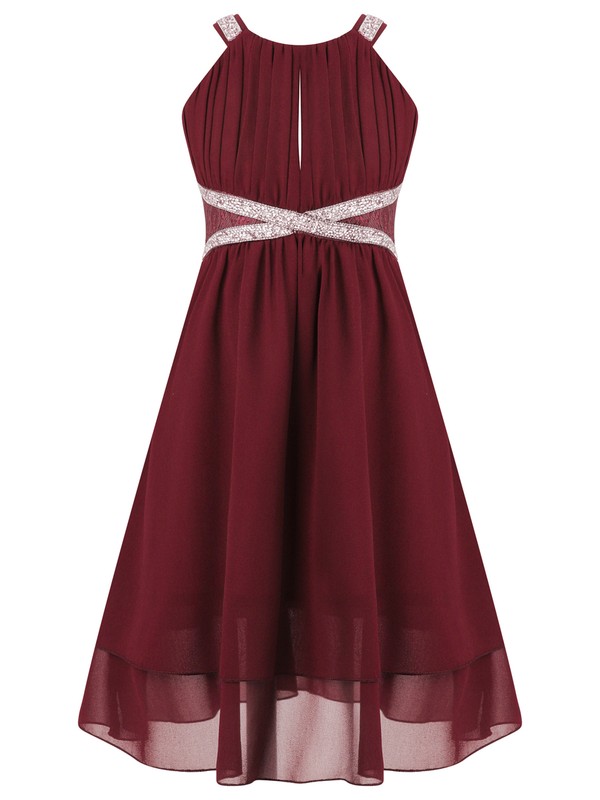 Featuring with sleeveless, chest keyhole, A-line design, tiered chiffon hem and back zipper closure.