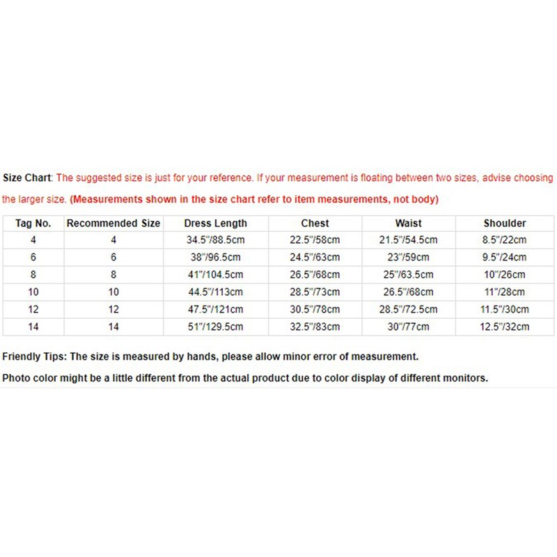 | Tag No. | Recommended Size | Dress Length | Chest | Waist | Shoulder |