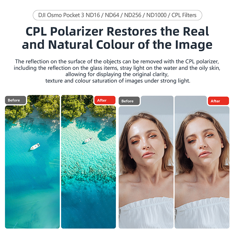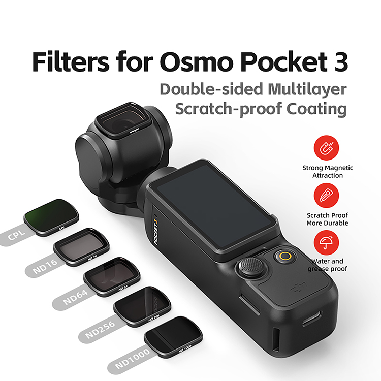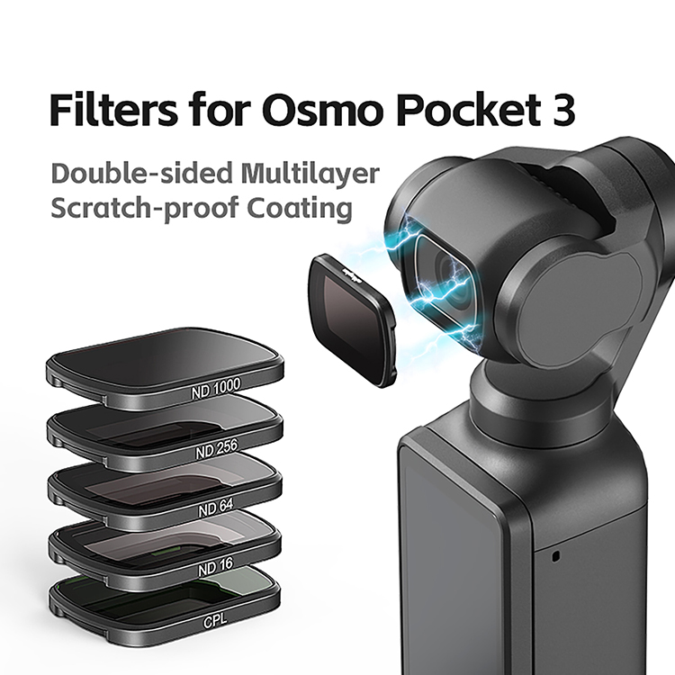 Features: l Scratch-resistant, water and greasy dirt proof SRL level glass guarantees solidness and high definition display l With large area of magnetic surface, the filter can be firmly attached to the lens to ensure free and secure use in various motion scenarios l Aluminum alloy frame case is reliable and durable allowing for character laser engraving l The filter is as thin as 2.2mm, which ensures the free rotation of the axle lock of Pocket 3. You can turn off the Pocket 3 without removing the filter Specification: l Material: Aluminum Alloy+Optical Glass l Types (Optional): CPL, ND16/64/256 + CPL, ND16/64/256/1000 l Size: as Shown l Applicable Model: for Osmo Pocket 3 Package: l 1x Fliter Or l 4x Filters