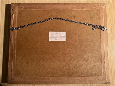 *The exterior of the frame measures approximately 15 3/4"x19", has a few small dings (see photos) and has sturdy hanging chain in place on back. Label on back reads: