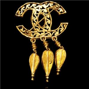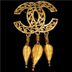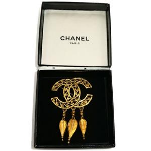 You have found the missing pieces to your designer jewelry collection! Here is an authentic vintage gold-plated brooch or pin from Chanel featuring interlocking CC logo with dangling fringe. It measures approximately 1 3/4" wide by 2 3/4" tall. It is in mint condition in original box. Please see our Not Just China Store for more of this collection.