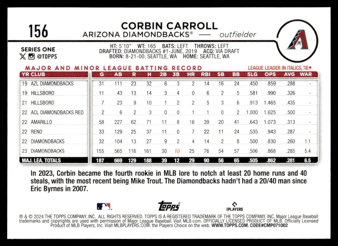 | Corbin Carroll 2024 Topps Series One 1 All Star Rookie Cup Card #156 Arizona |