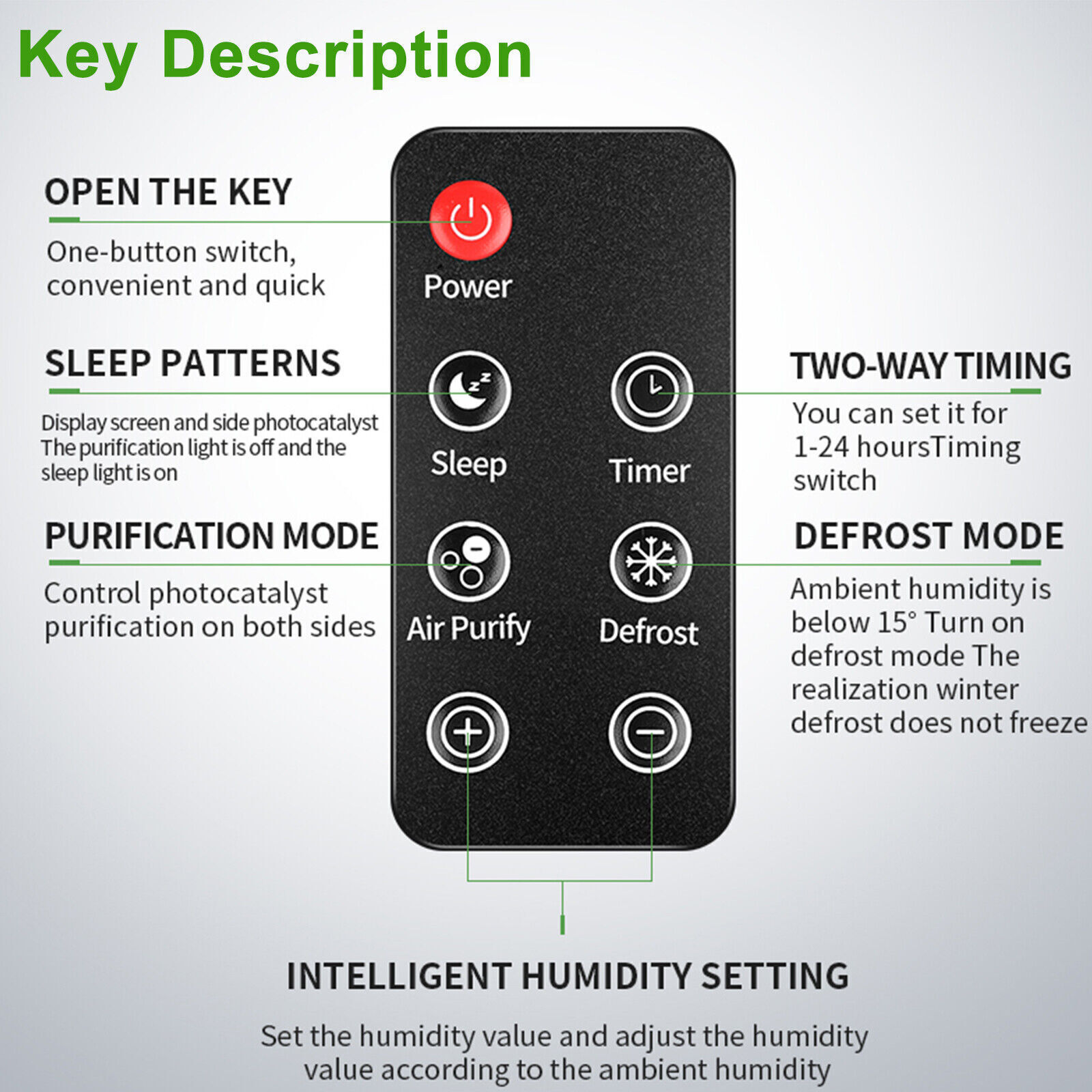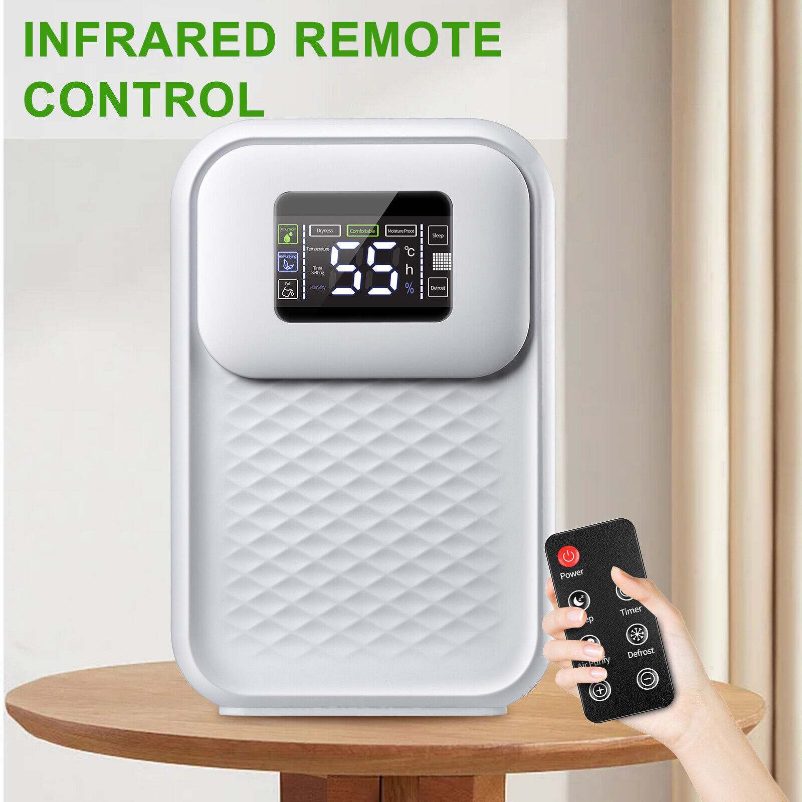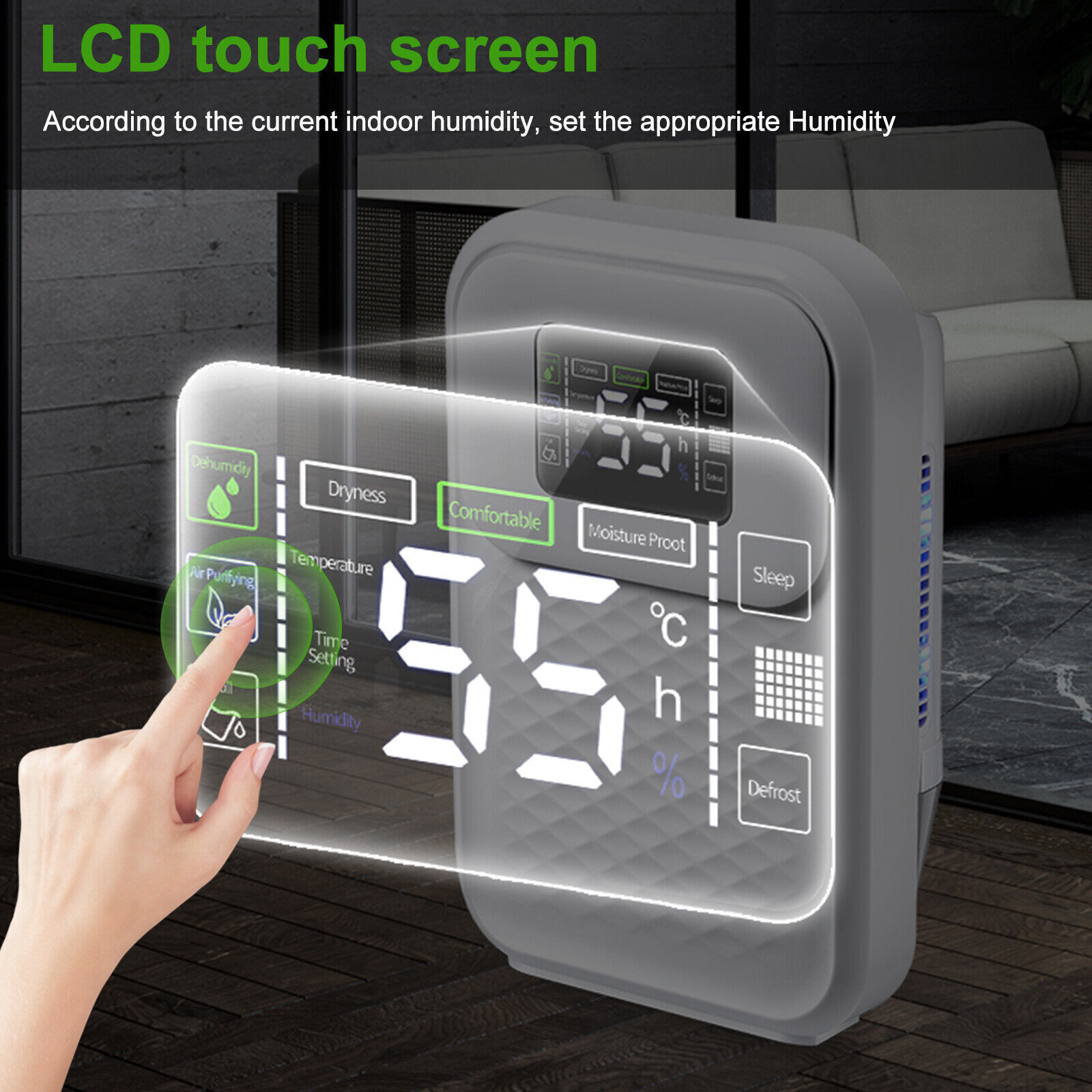 【LCD Touch Screen】1: The machine is designed with LCD digital display, you can get the temperature and humidity at any time, and the operation process is clear at a glance; 2: The dehumidifier is controlled by touching, which is more convenient; 3: 24 hours timer; 4: Sleep mode- the noise is reduced and the screen goes off; 5: Set the target humidity; 6: Negative ion air purification, and double filter purification; 7: Automatic defrosting in low temperature environment