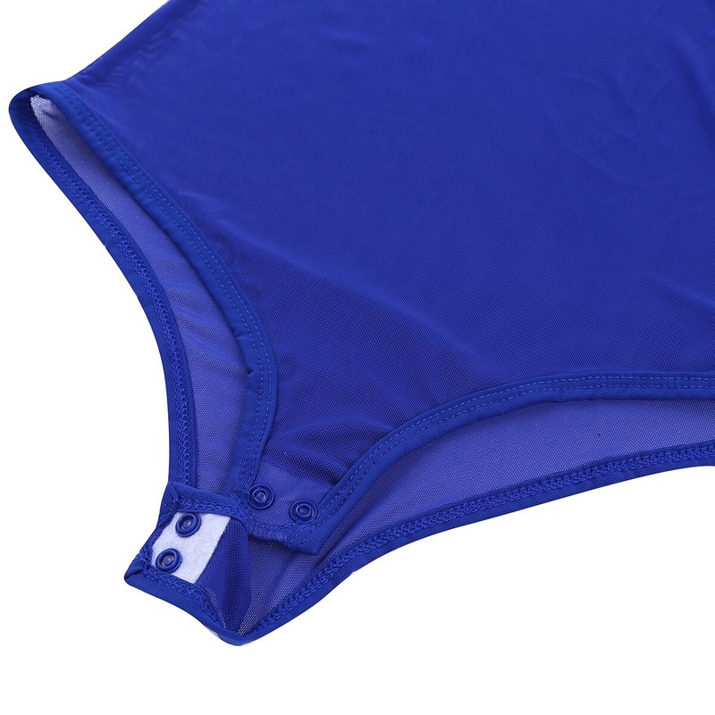 Long sleeve, open bust, high cut legs, mesh see throuth sheer design, crotch with snap button closure.