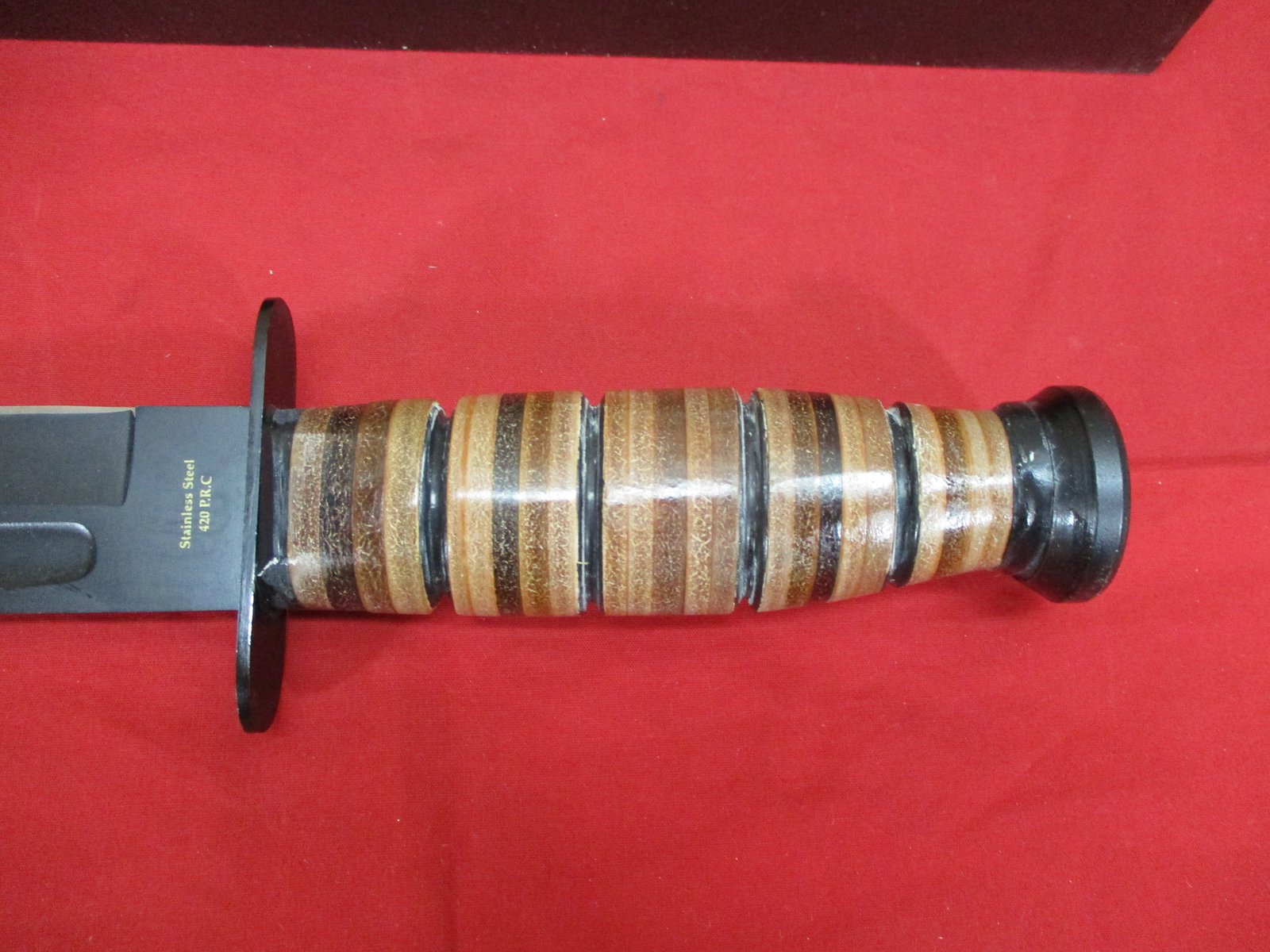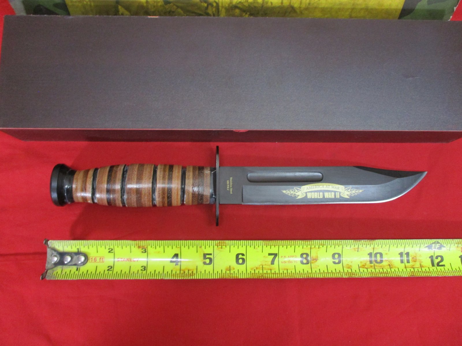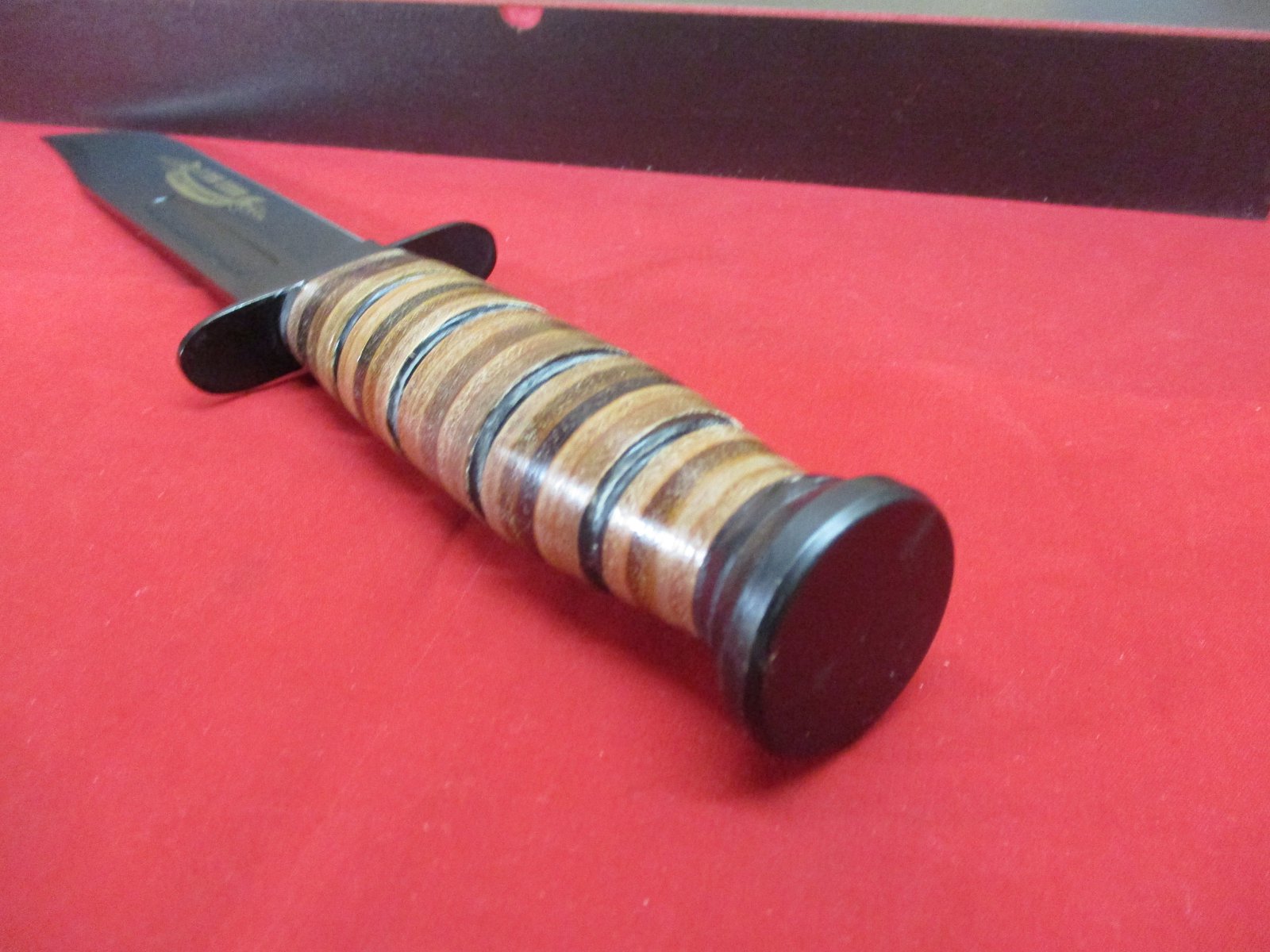 The blade has a black matte finish, and each side features a gold-tone tribute that honors the battle and the courageous individuals who fought in it. The rugged, hardened rubber handle is tough and wrapped with specially treated leather grips to replicate the true look and feel of the Marine Corps' classic fighting weapon.