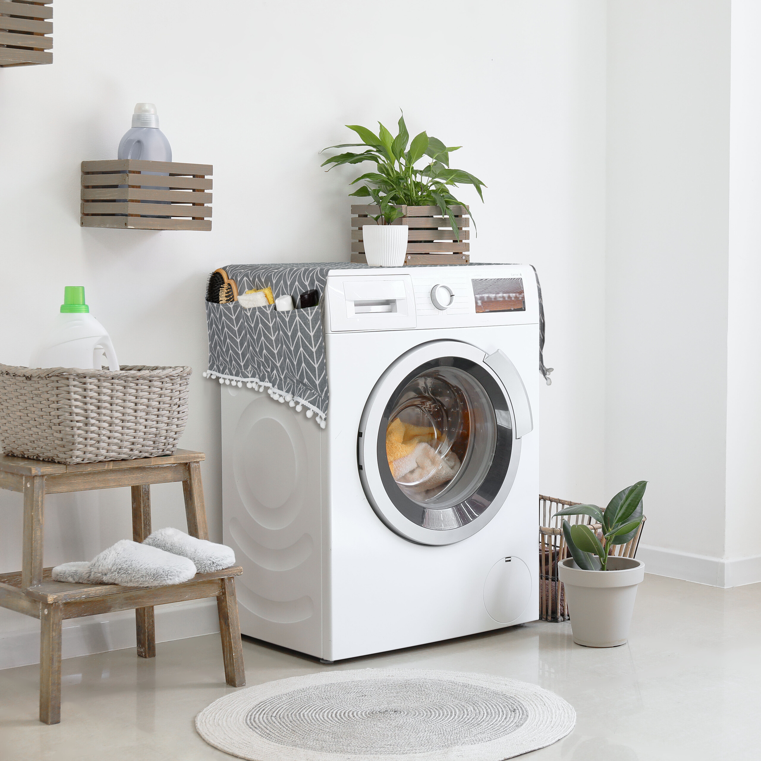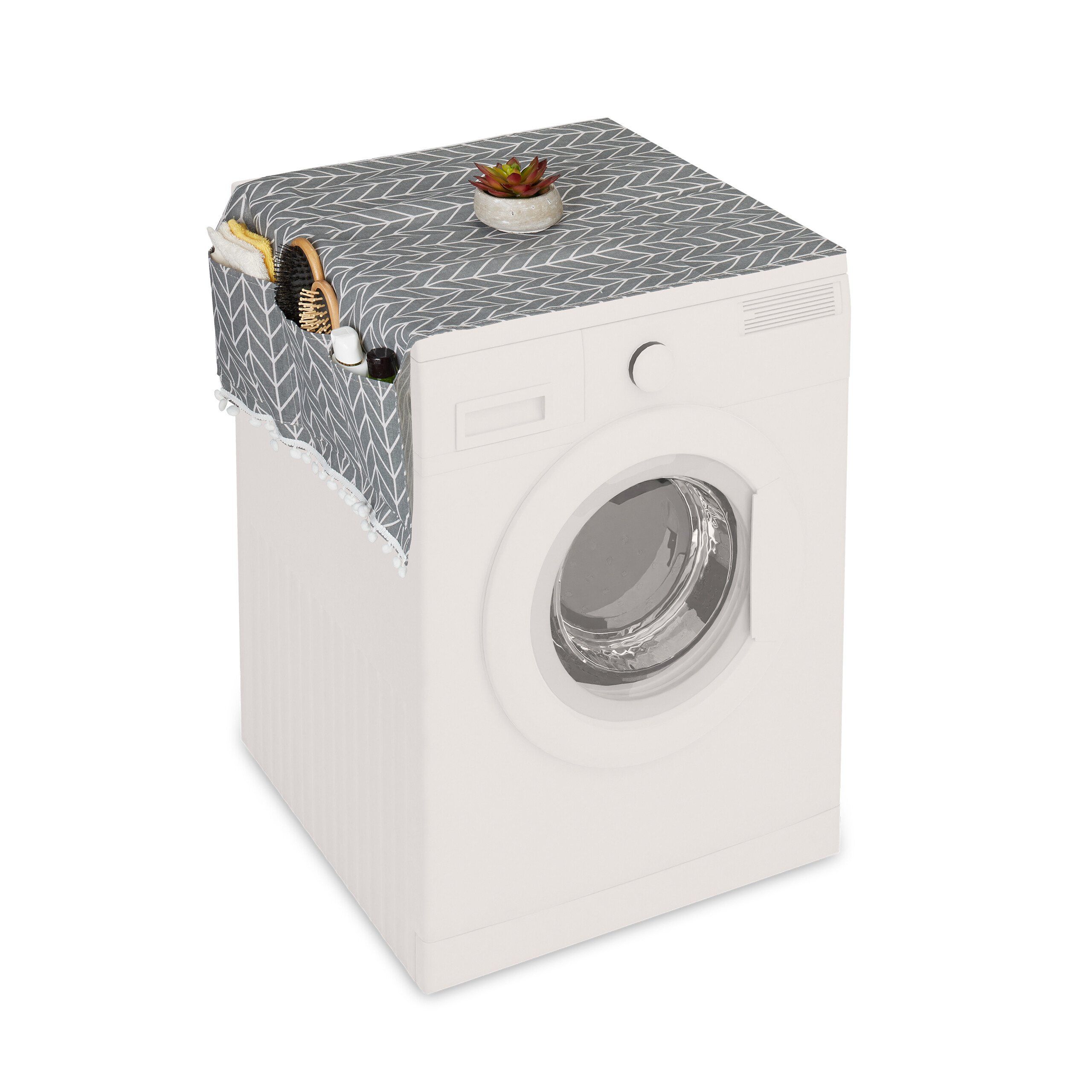 - Stylish: Grey overlay for the washing machine with graphic pattern and pompons - Great decoration