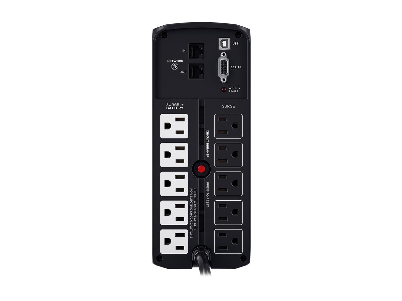 10 NEMA 5-15R OUTLETS: Five battery backup & surge protected outlets; Five surge protected outlets; INPUT: NEMA 5-15P right angle, 45 degree offset plug with five foot power cord